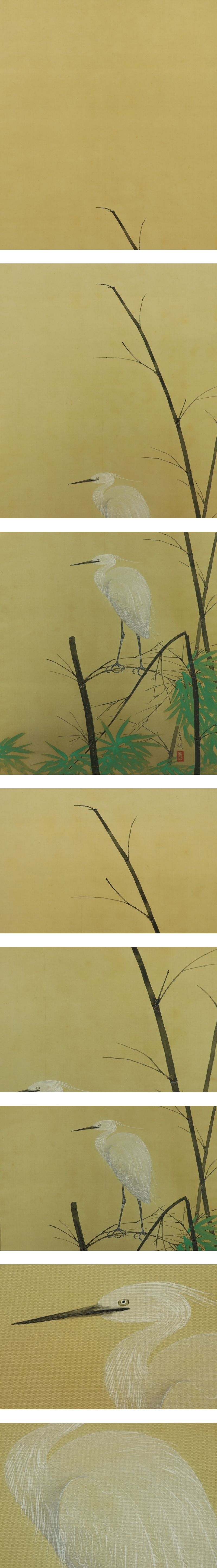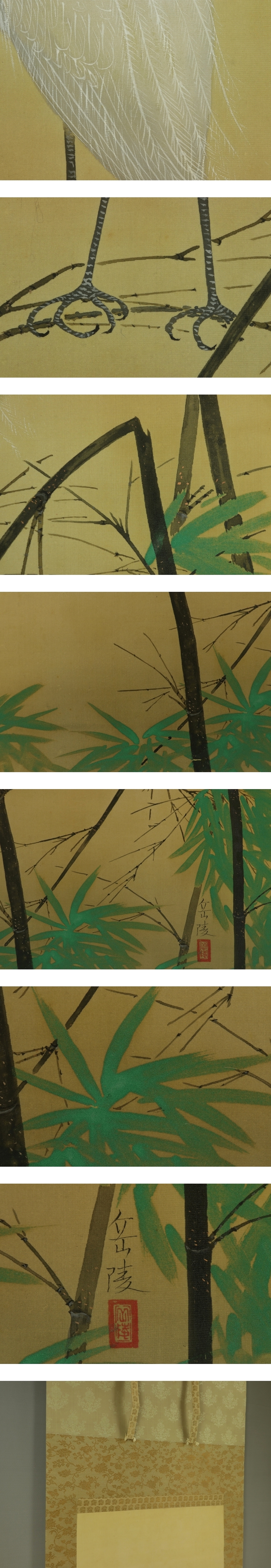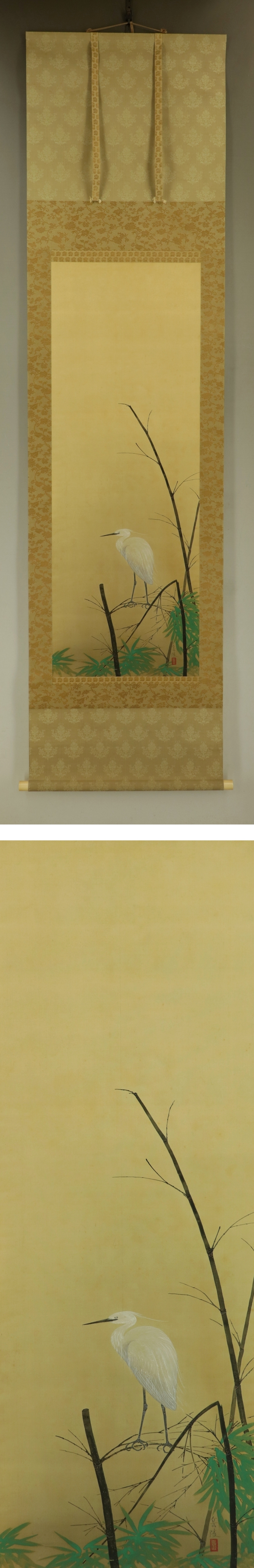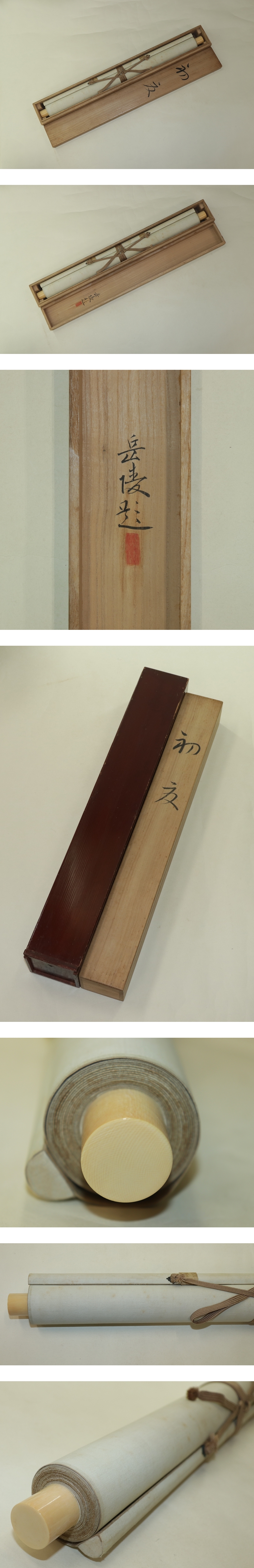 中村岳陵 なかむら-がくりょう(1890-1969) 日本画家。静岡県生。名は恒吉。東美校卒。川辺御楯に師事する。 古土佐の画風を究め、同時に近世西欧絵画の描法を取り入れて、 卓抜した描線と清明な色彩を活かした作品を作り出す。 福田平八郎、牧野虎雄らと六潮会を結成。芸術院会員。 毎日芸術大賞・朝日文化賞受賞。文化功労者。文化勲章受章。 昭和44年(1969)歿、78才。 本紙は、染み、ヤケがあります。 表装は、染み、汚れ、軽い皺があります。 【サイズ】 作品 横約42cm×縦約119cm 表装 横約56cm×縦約215cm |
