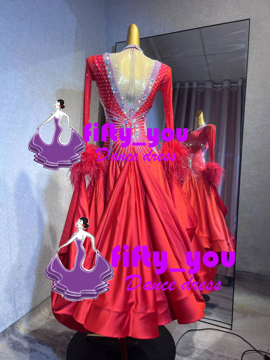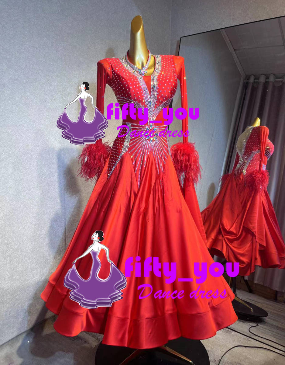 新品fifty_you レディース社交ダンスドレス  モダン競技会用ダンスドレス ゴージャスライトストーン飾 サイズオーダー ファー付 赤色