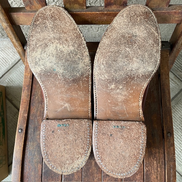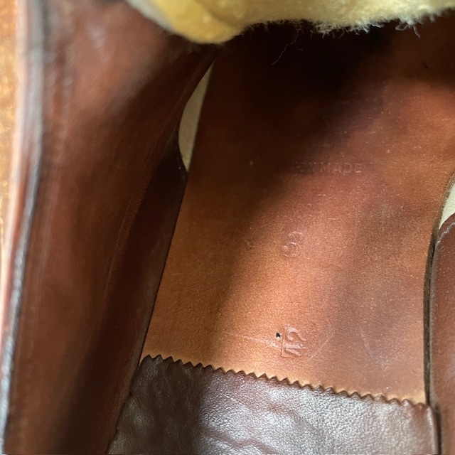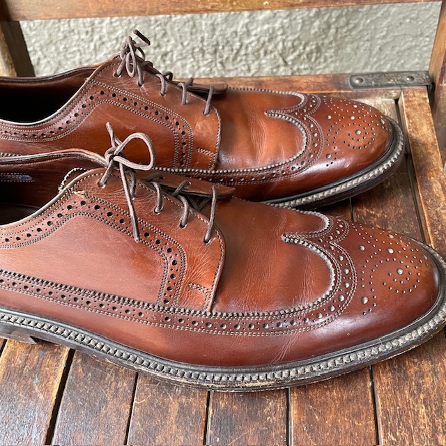 アメリカで購入しましたレザーシューズです。メーカーはフローシャイムになります。なかなか出回らない素晴らしい一足です。1960〜70年代前半あたりの一足と思います。インソール奥にunion made  3  42 と刻印があります(写真参照)。表記サイズは10 D , アウトソール長さ32cm、アウトソール最大幅11.5cmです。 おおおよそですが27.5cm位の方向けです(足の形状によりますので参考まで)。状態は良好ですが、USED品につきビンテージ物とご理解頂いてお願い致します。