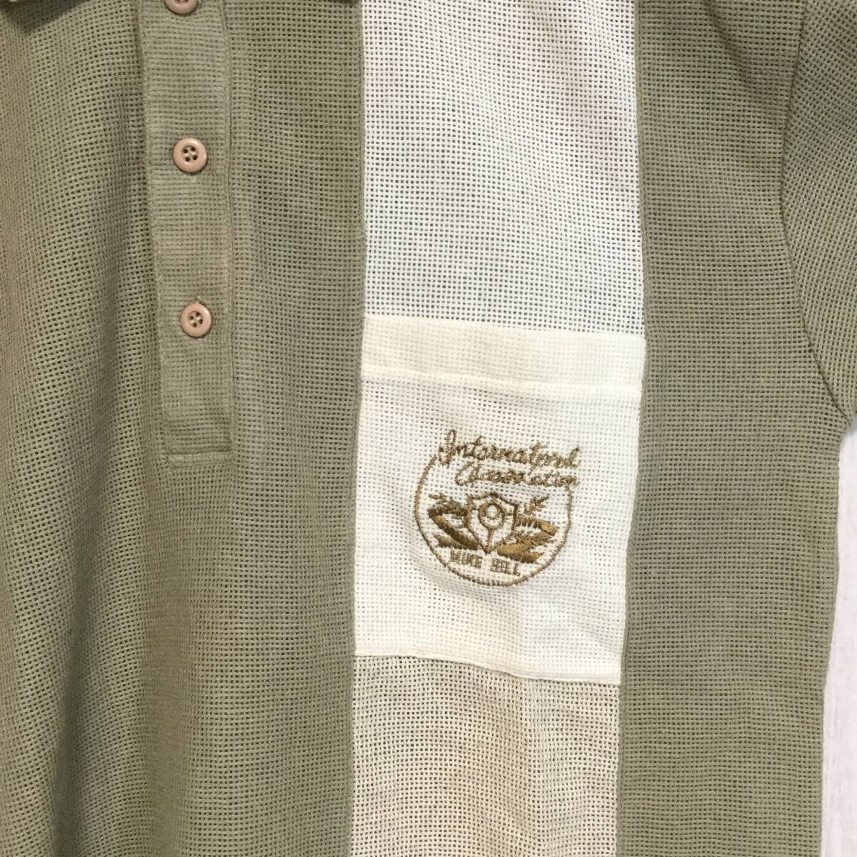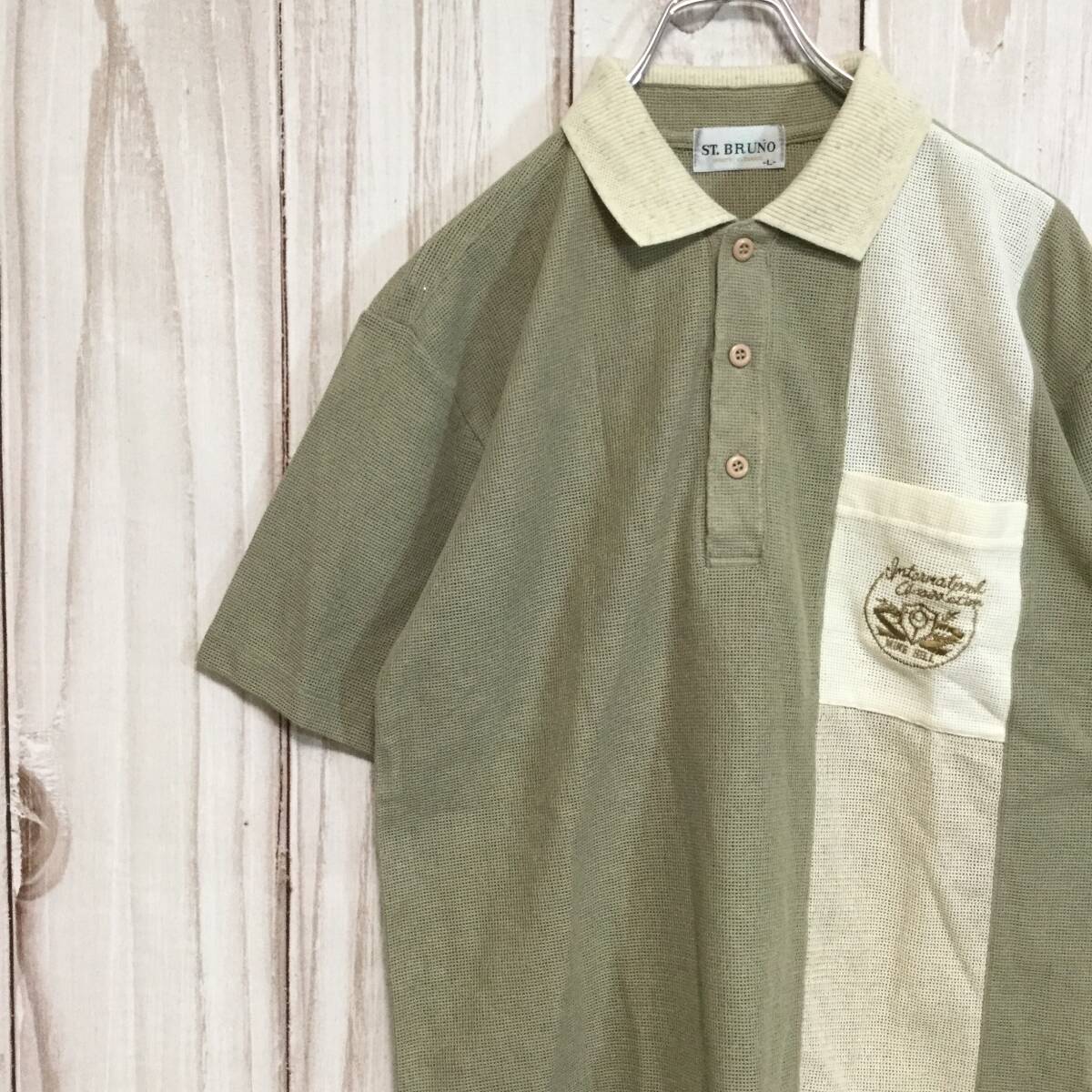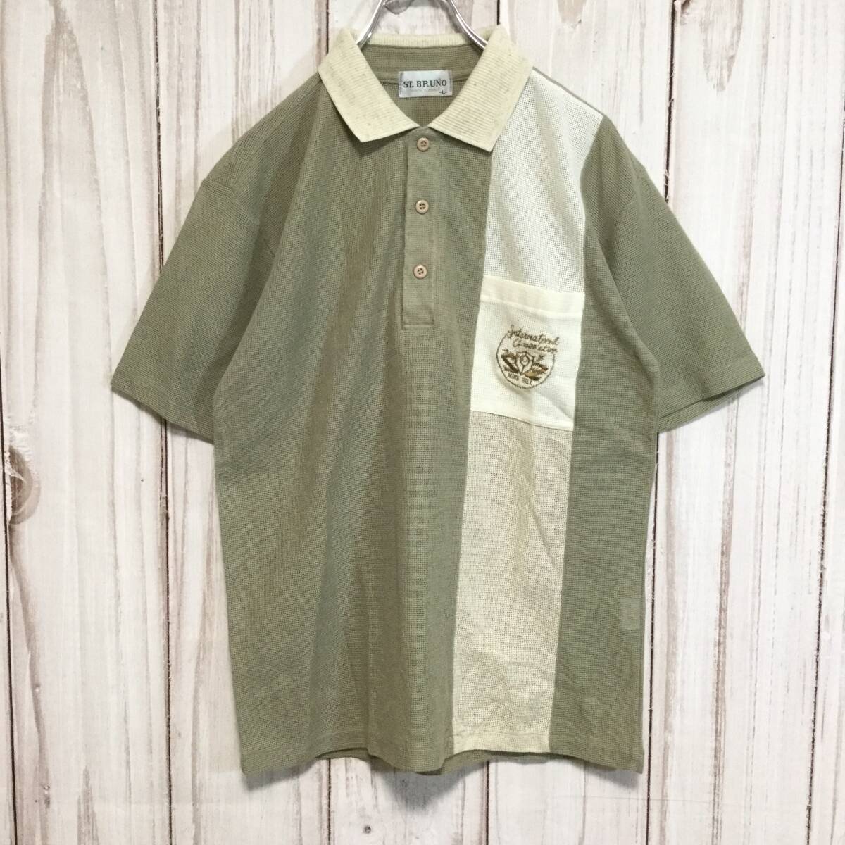 【麻混 半袖ポロシャツ】美品 デッドストック 未使用品 サマーニット 刺繍 ポケット 襟色違い アシンメトリー 透け感 ナチュラルカラー L
