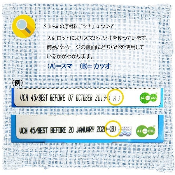 シシア キャットシリーズ ゼリー&クッキングウォータータイプ「ツナ&キヌア」 1個消化しやすく、水分も摂りやすい。 ビタミンやミネラルを多く含んだ栄養価の高いウエットフード。【原材料】ツナ51%、キヌア5%、ベジタブルゼラチン、ビタミンA1325IU、ビタミンE15mg、タウリン160mg【成分】粗たん白質12%以上、粗脂肪0.8%以上、粗繊維0.5%以下、粗灰分1%以下、水分85%以下【カロリー】51kcal/100g※原材料のツナはロットにより(A)Euthynnus affinis:スマか(B)Katsuwonus pelamis:カツオです。 Made in : Thai