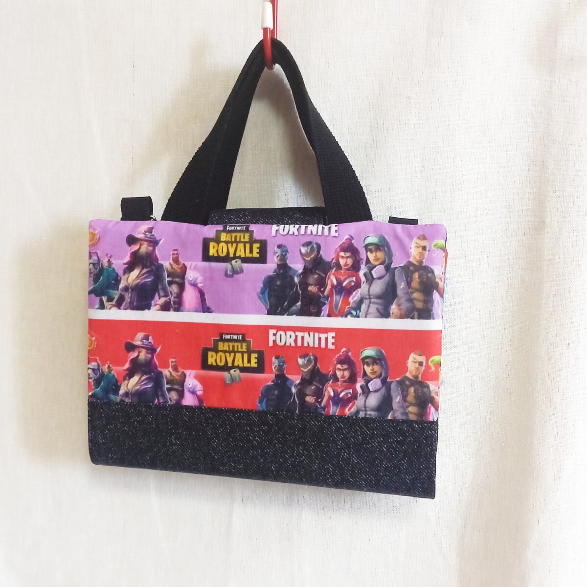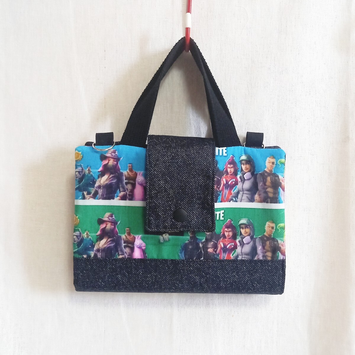持ち手ベルトの横にDカンを付けましたのでお手持ちのショルダーベルトを付けて頂くと肩掛けでもご使用頂けます♪