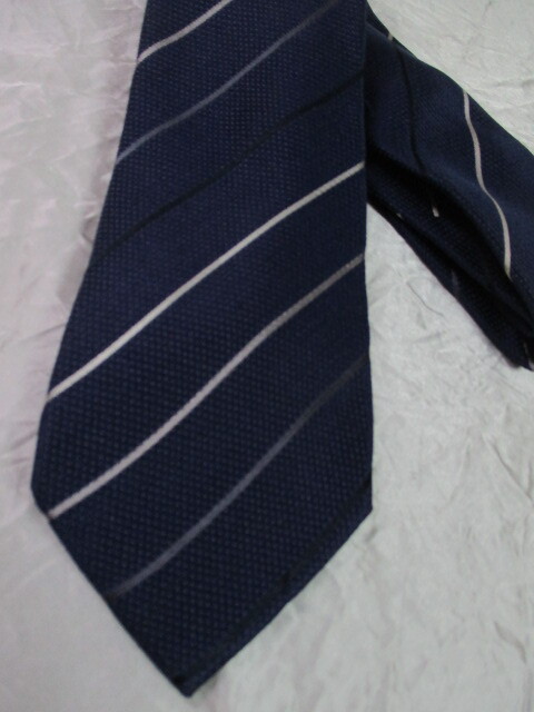| 商品紹介 | 黒、グレー、白の斜めストライプの柄が入った ネクタイです。 地色はネイビーです。 シンプルでどんなスタイルにも合わせやすいです。 【素材】絹100% |