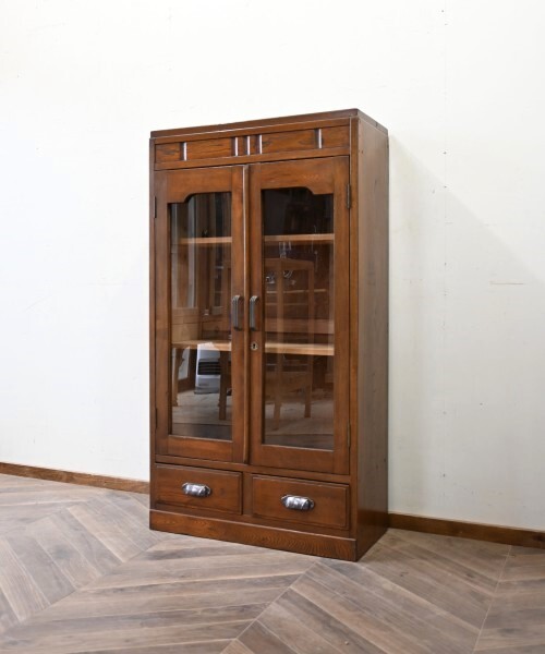 古いガラス扉の引き出し2杯収納棚 アンティークアトリエ本棚書棚店舗什器