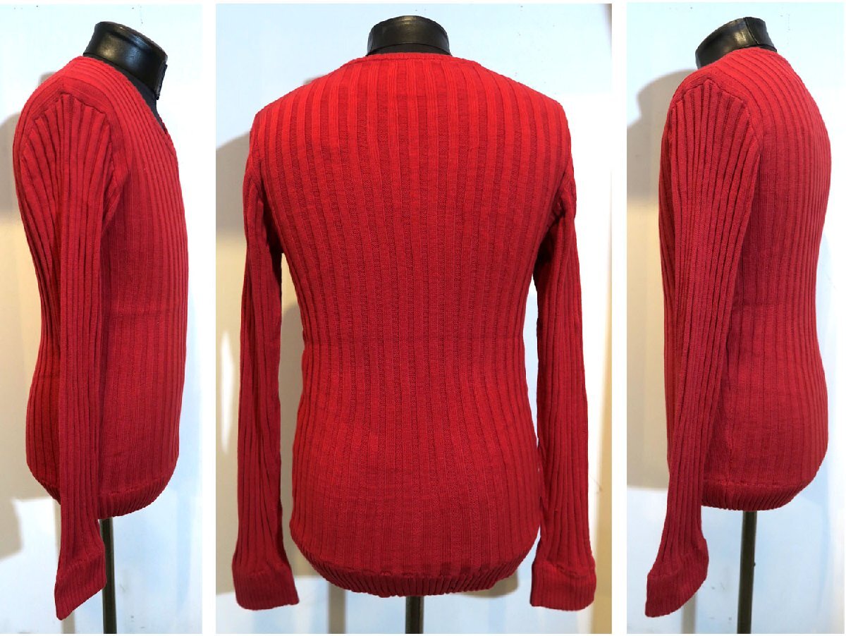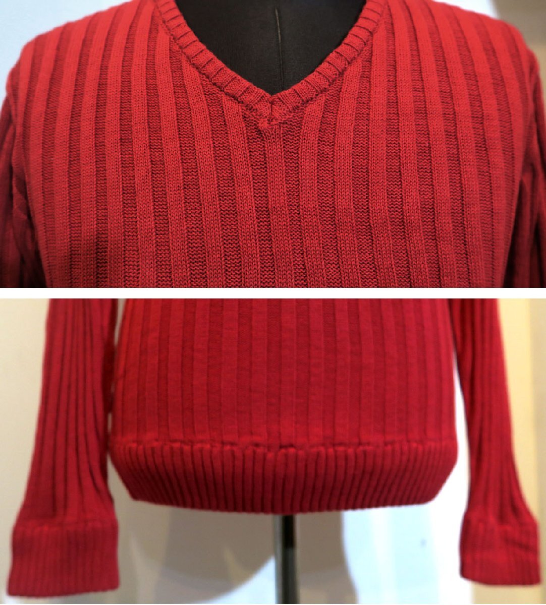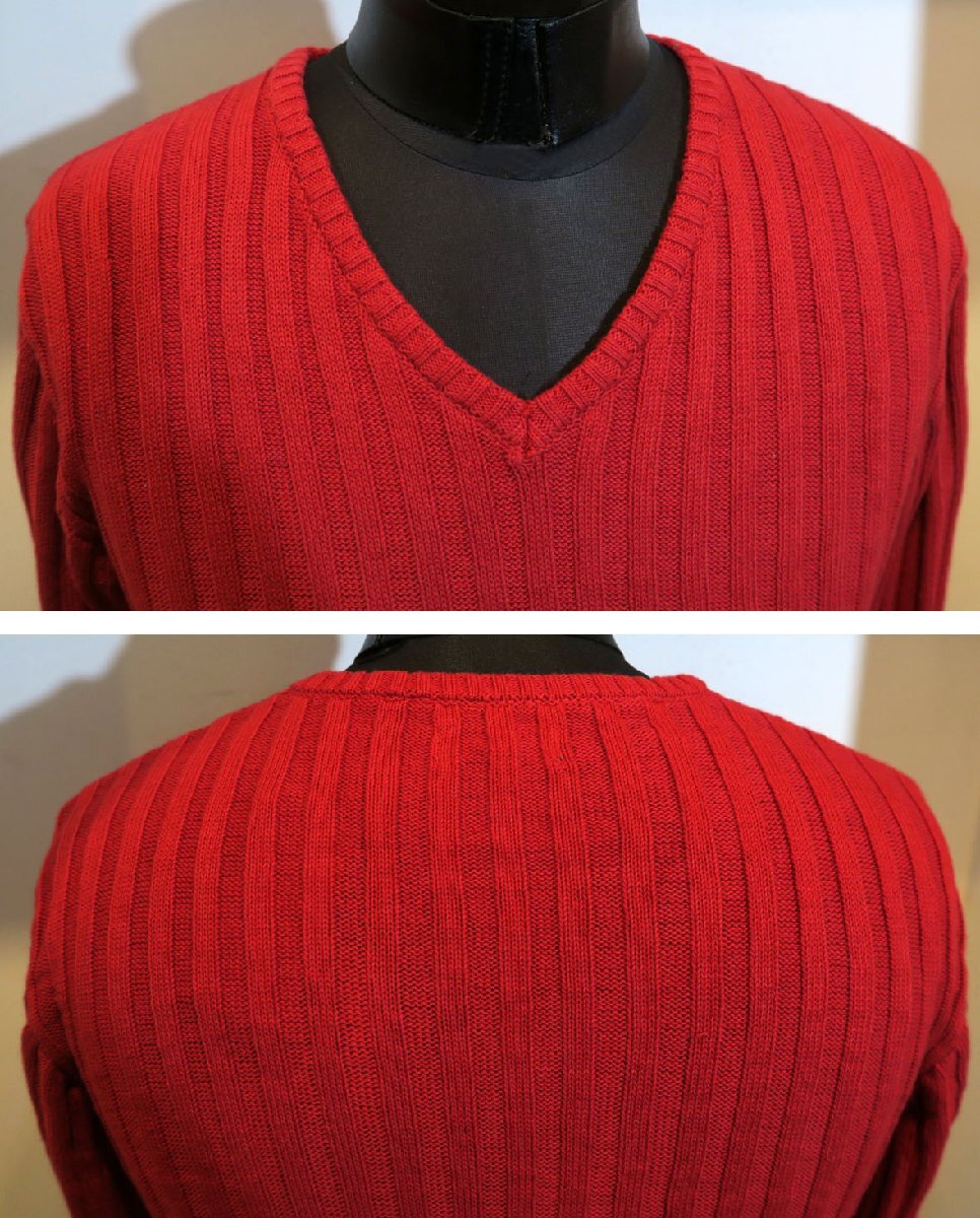 新品 Lサイズ Vネック 綿100% ニット 330010 RED 赤 レッド メンズ 針抜き リブニット タイトフィット セーター インナー 重ね着 モード