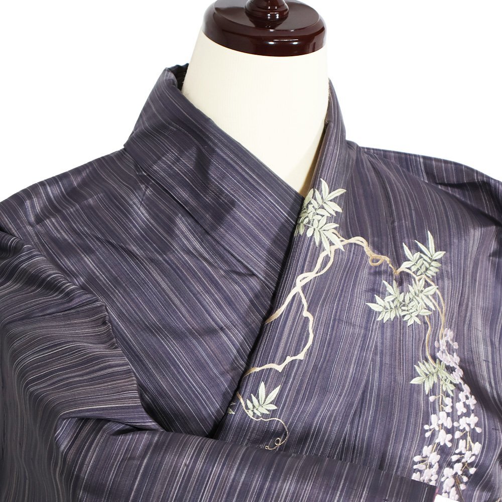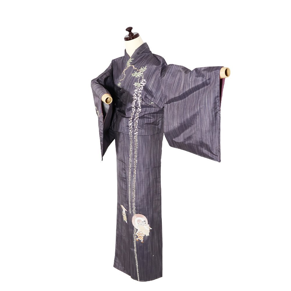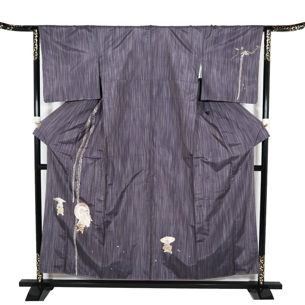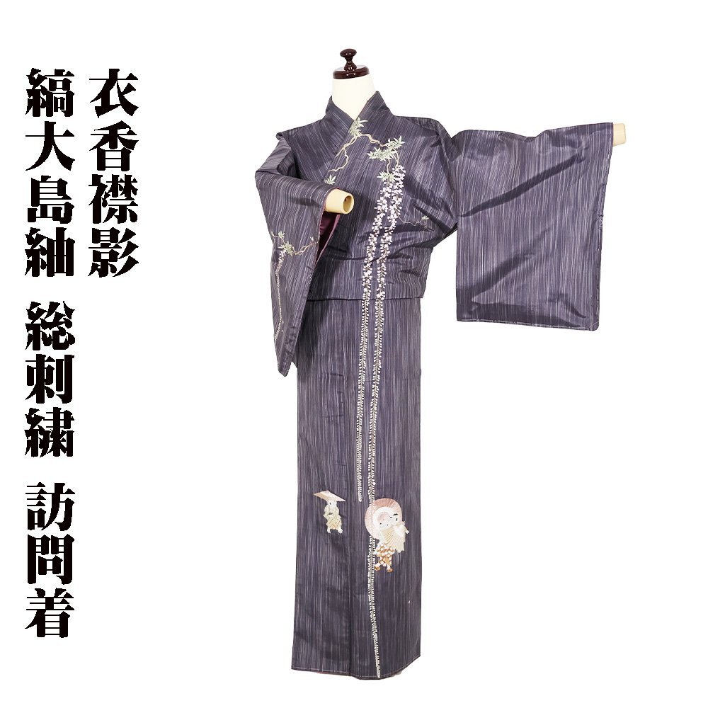 | 縞大島紬 訪問着 袷 赤紫・紫・縦縞地 総刺繍・童・番傘・藤 163 広襟 未使用品 仕付け付き | |