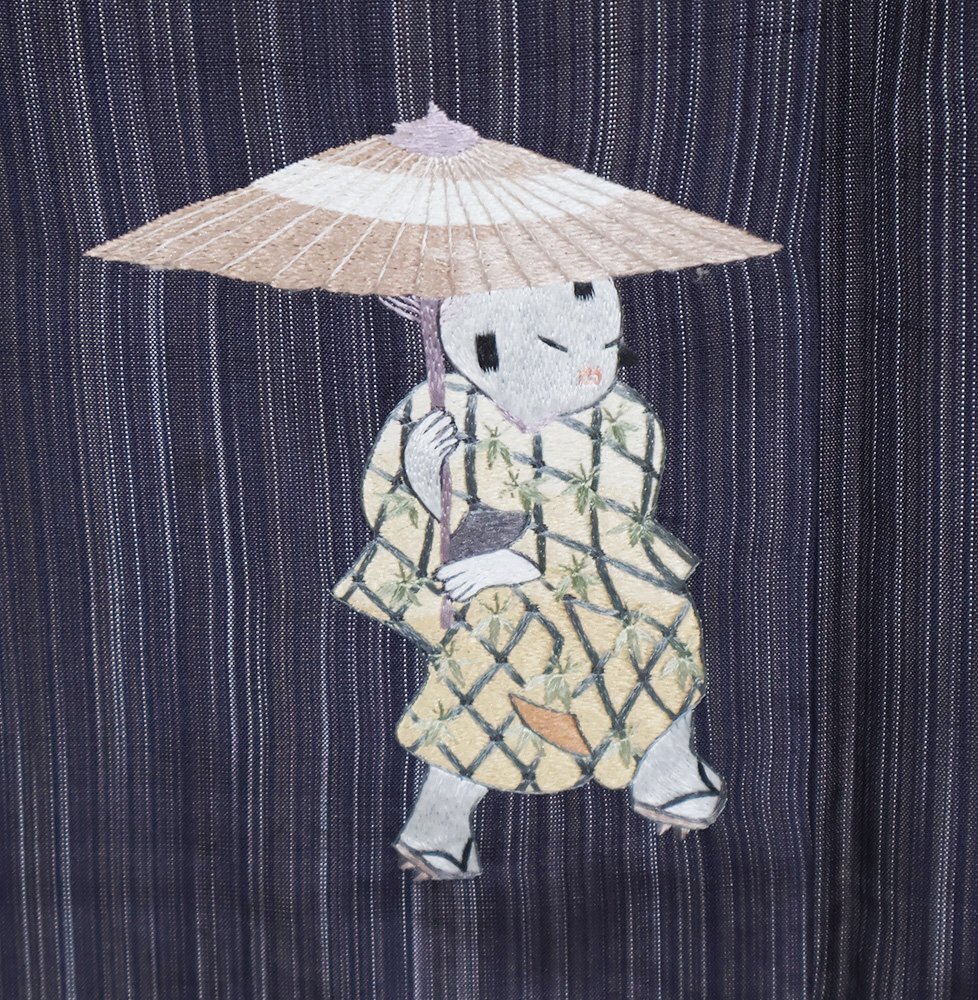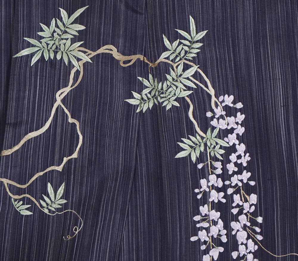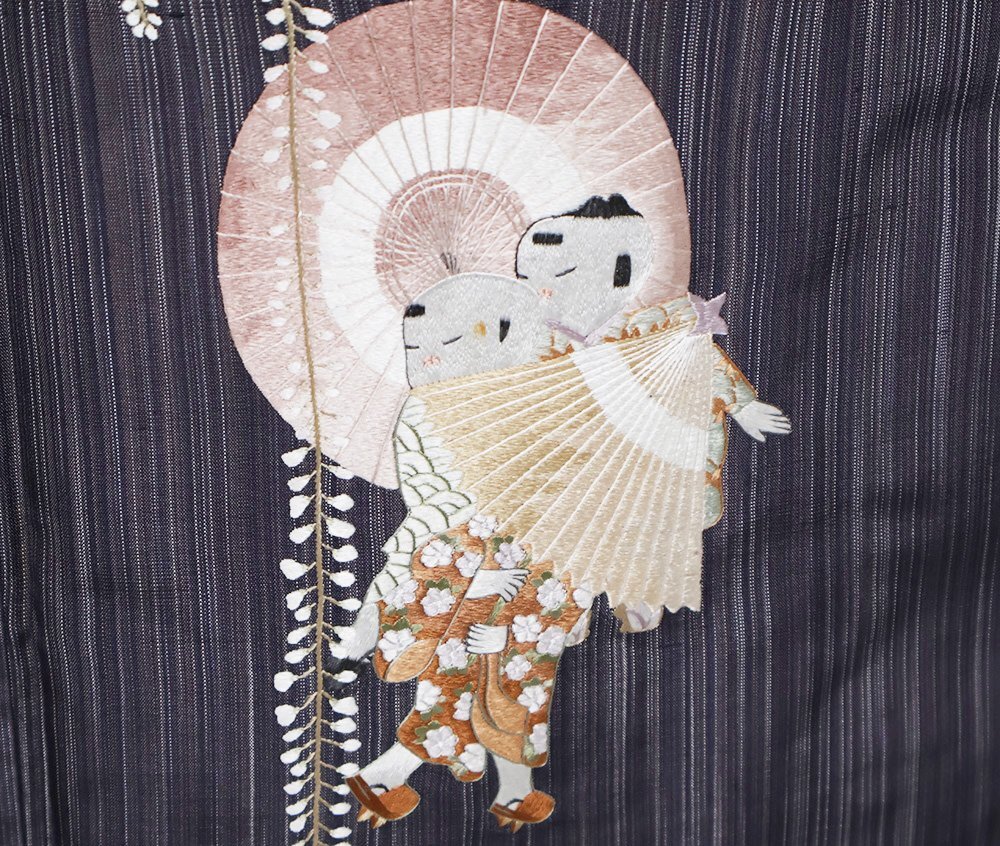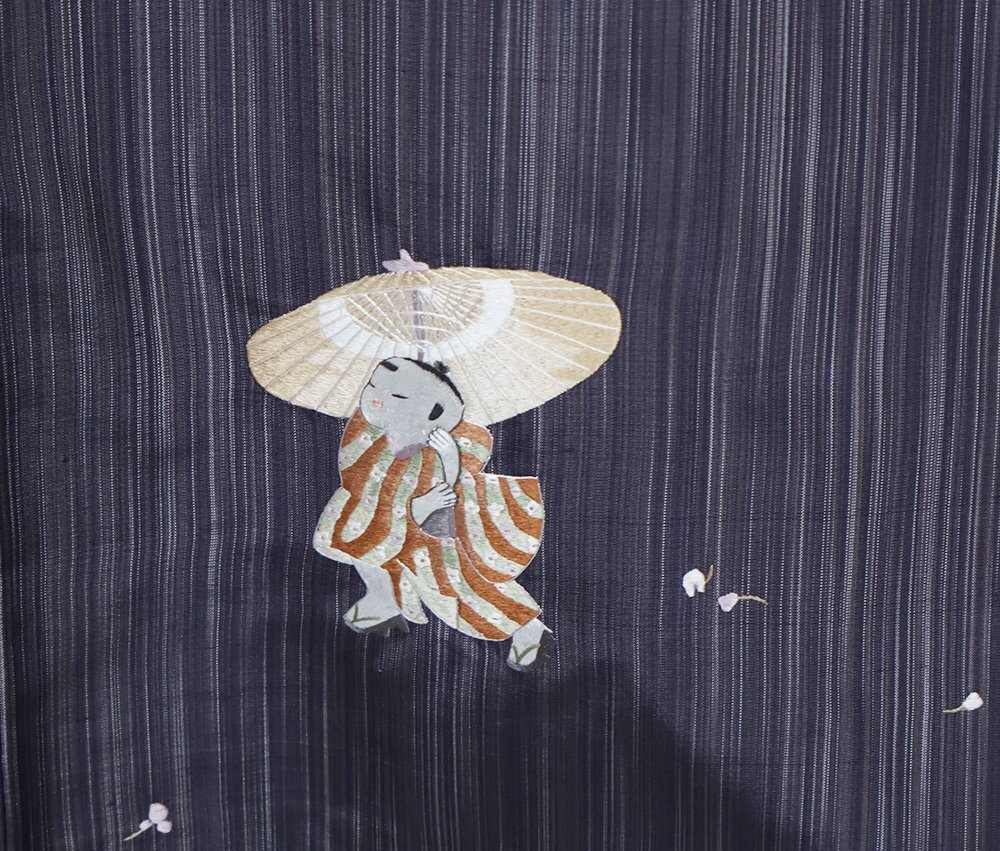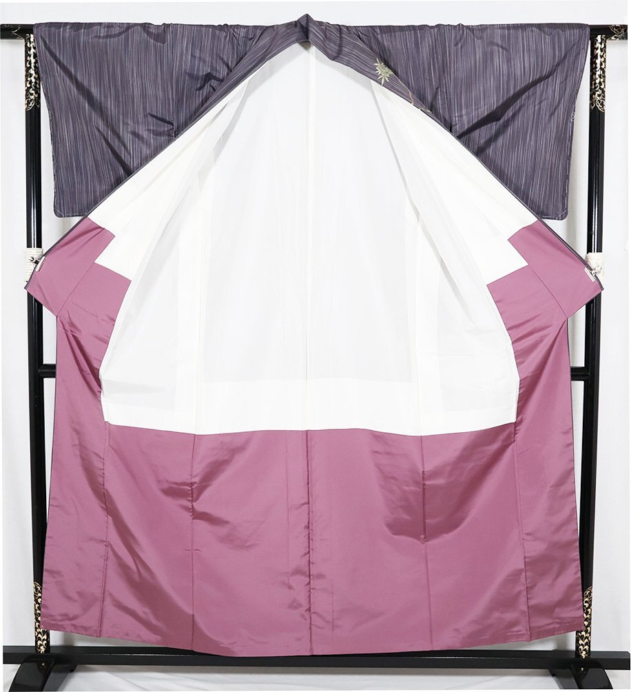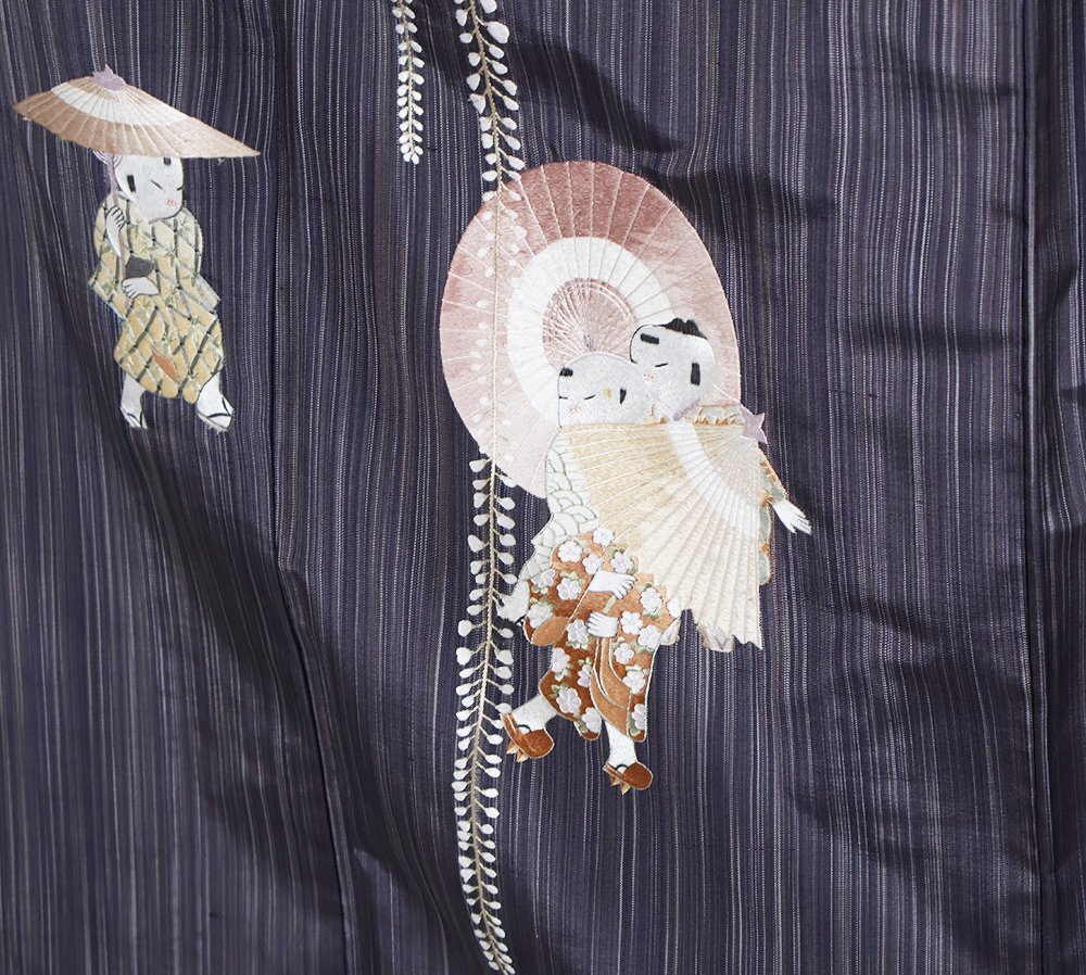 | 色・柄 | 縞大島紬 訪問着 袷 赤紫・紫・縦縞地 総刺繍・童・番傘・藤 (写真では上手く色が出ない場合があります。ご了承下さい) |