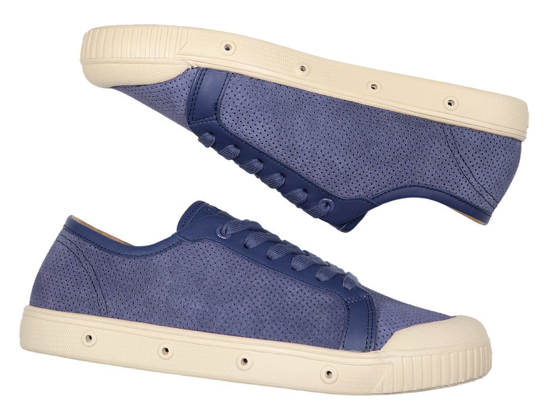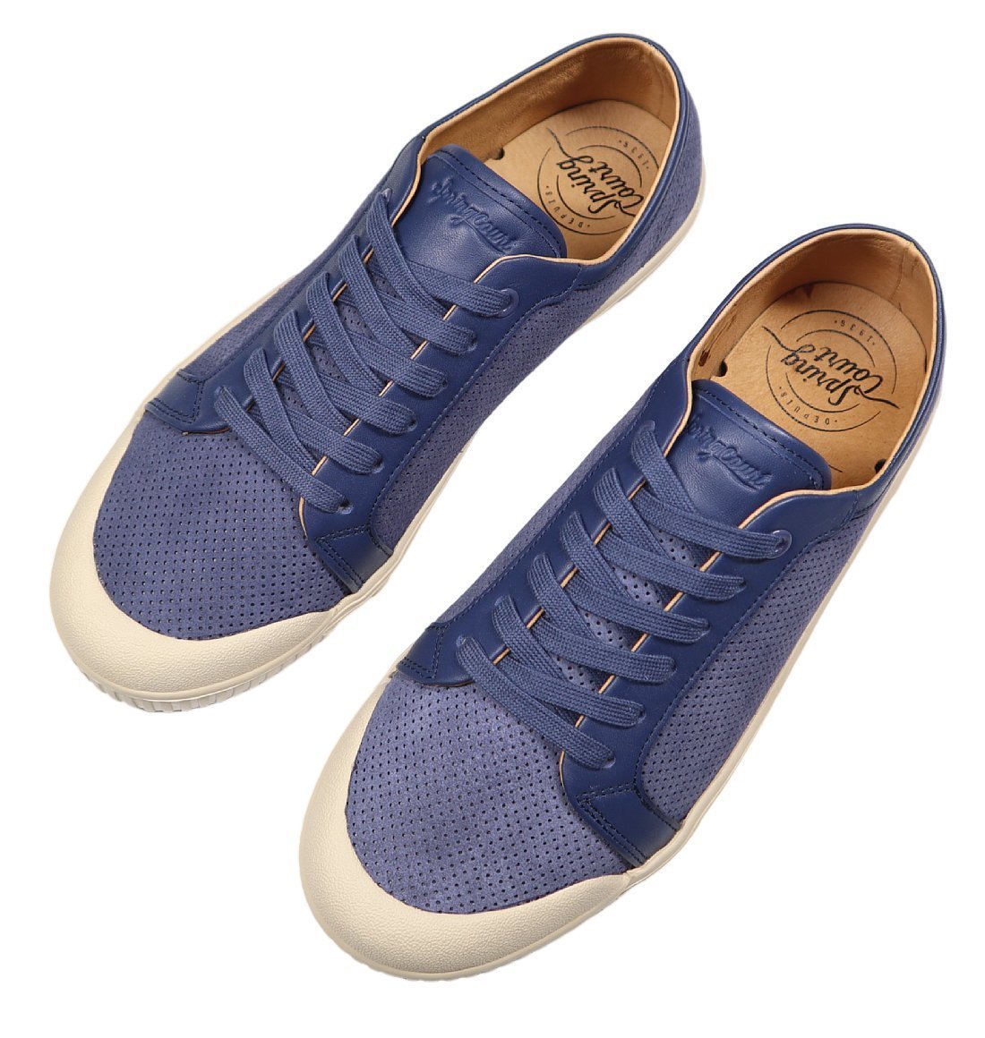 こちらはそのアッパーをヴィンテージ感あるブルーのナッパスエードレザーとナッパレザーに変更し、さらにパンチング加工とパイピング(踵)を施したもの。ノーブルで洒落たヴィンテージ感あるスタイルのスニーカーに仕上がっています。