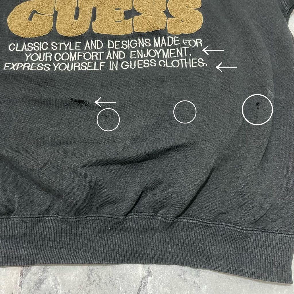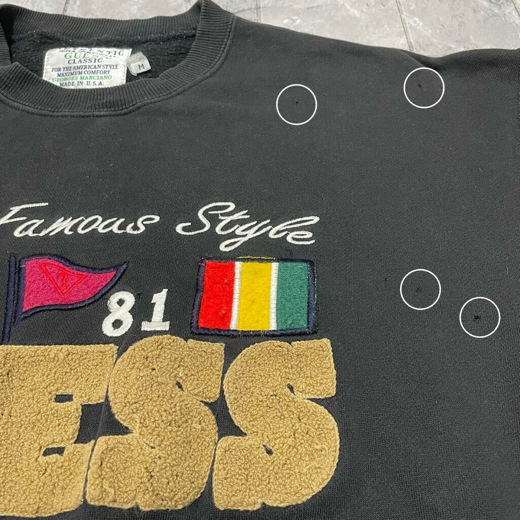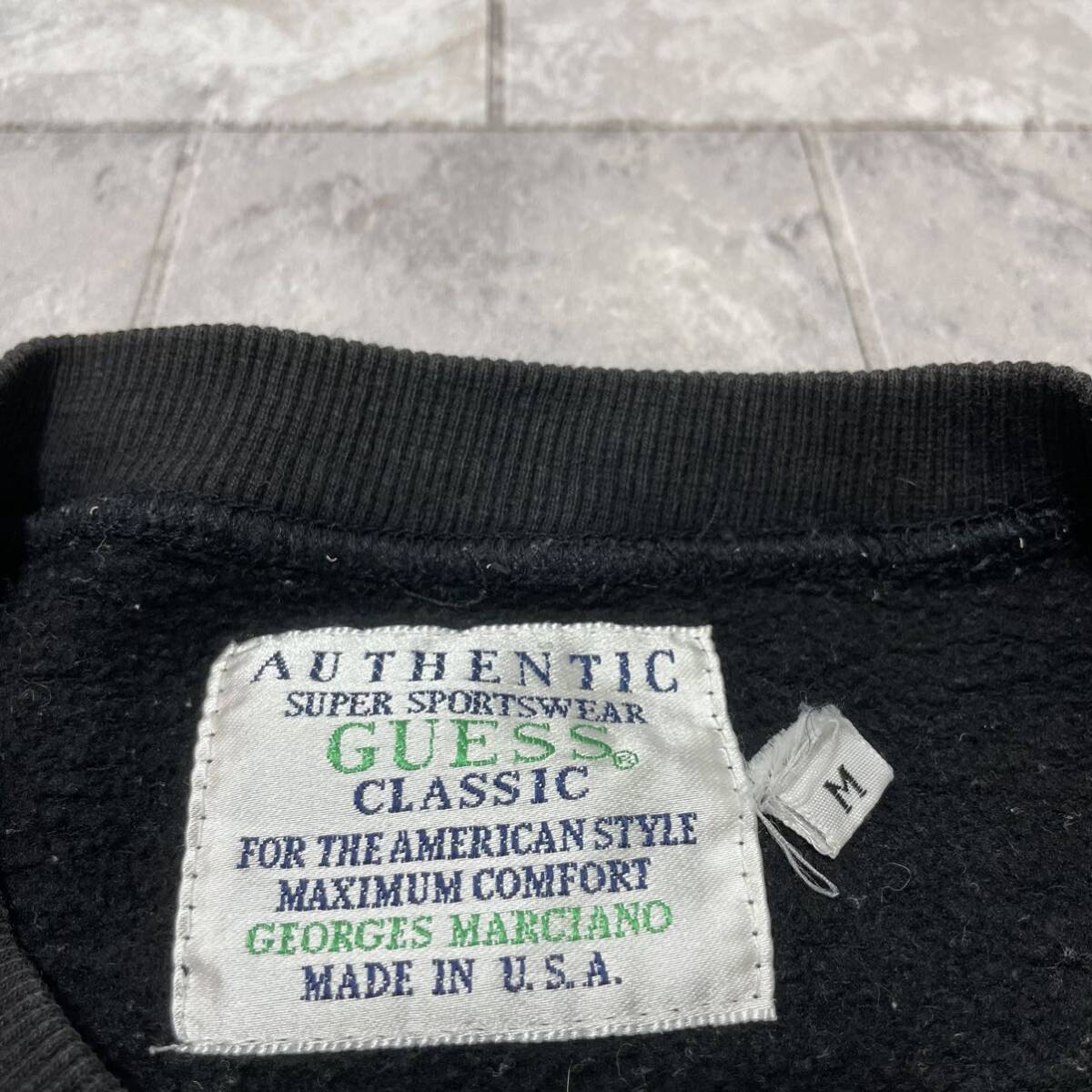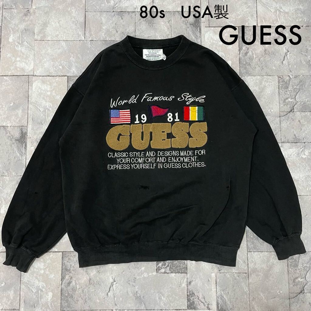 80s USA製 GUESS ゲス sweat スウェット トレーナー 国旗 刺繍ロゴ ビッグロゴ ヴィンテージ アメカジ 緑タグ 90s ブラック 玉FL3523