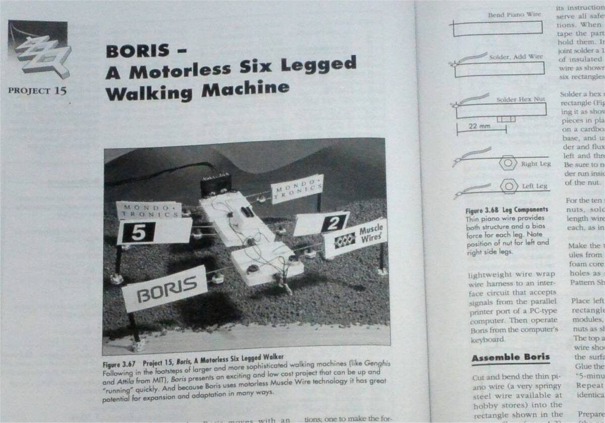 Basic lever action, ratchets and latches, model railroad crossing, AC power circuit, solar power circuit, paper airplane launcher, life-like butterfly, rubber tube flexi, proportional control, radio control interface, programmable multiple wire controller & serial port interface, PC parallel port interface and much more. Boris the six-legged motorless miniature walking machine.