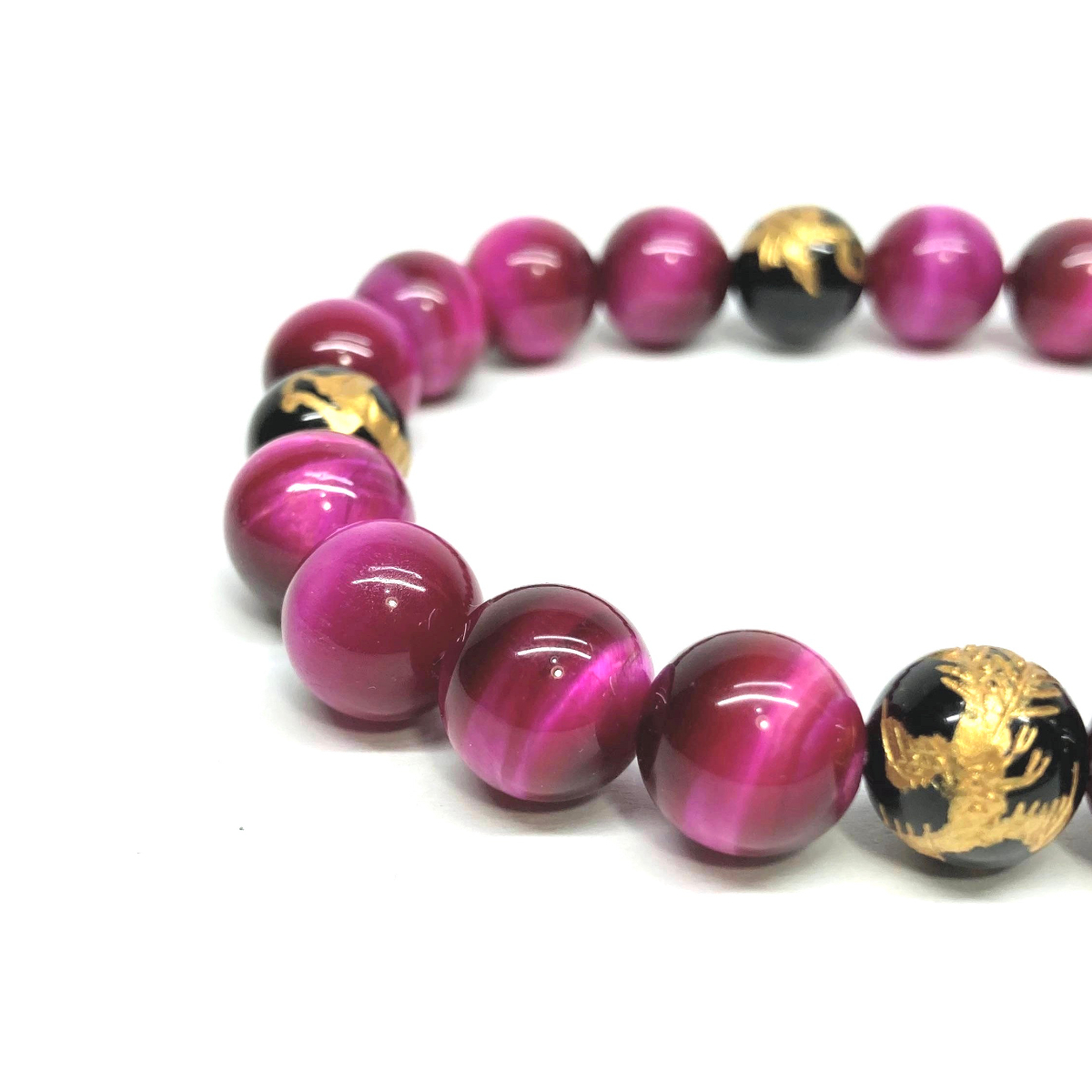 こちらは、四神獣金彫オニキスとピンクタイガーアイを組み合わせたパワーストーンブレスレットです。四神獣は、中国の伝説で4つの方向(東西南北)を守護する神聖な神。四神獣、厄災から身を守り、多くの運気を呼び込むと言われております。石大きさは程よくインパクトのある10mm玉で内周 約17cmです。 数に限りがございますので気になる方はお早めにどうぞ。