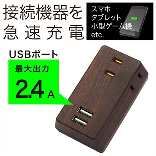 1)USB×2/AC3個口[直挿し]・ダークウッド M4226-DW・・Color:ダークウッドStyle:1)USB×2/AC3個口[直挿し]・本体サイズ:幅4.7×奥行2.6×高さ8cm・本体重量:60g・コンセント差し込み口:3個口・合計1400Wまで・USBポート:2個口・合計2.4Aまで(定格出力=DC5V)●木目調がインテリアになじむコンセントタップ ●コンセントは合計1400Wまで ●USBポートは合計2.4Aまで出力可能 ※充電用USBケーブルは付属なし