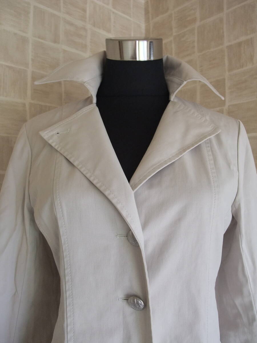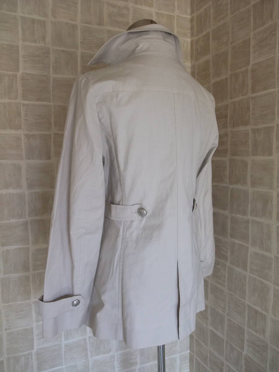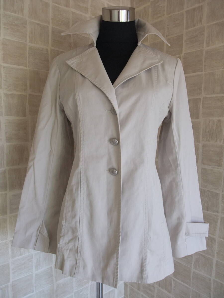 【表示サイズ】38A ■実寸サイズ■身幅45㎝・肩幅39㎝・袖丈59㎝・着丈67㎝ ■素材■ポリエステル66%・綿32%・ポリウレタン2% ■お色■ベージュ ■状態■結構着用しましたので着用感があります。袖丈ペンのような跡があり襟もとに汚れがあります。 ※取外し可能な裏地がついていたんですけど探してみたのですが見つかりませんでした | |||