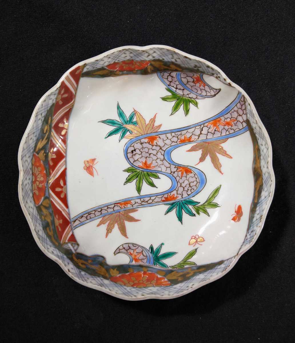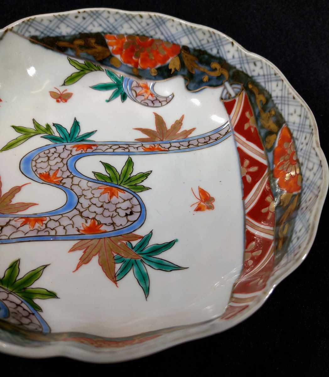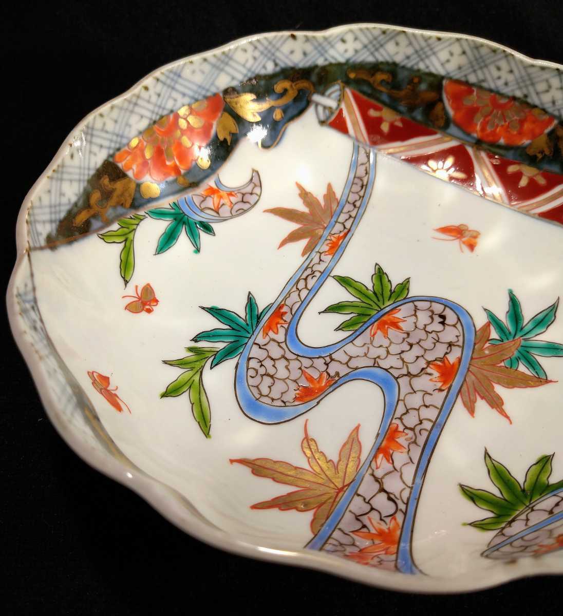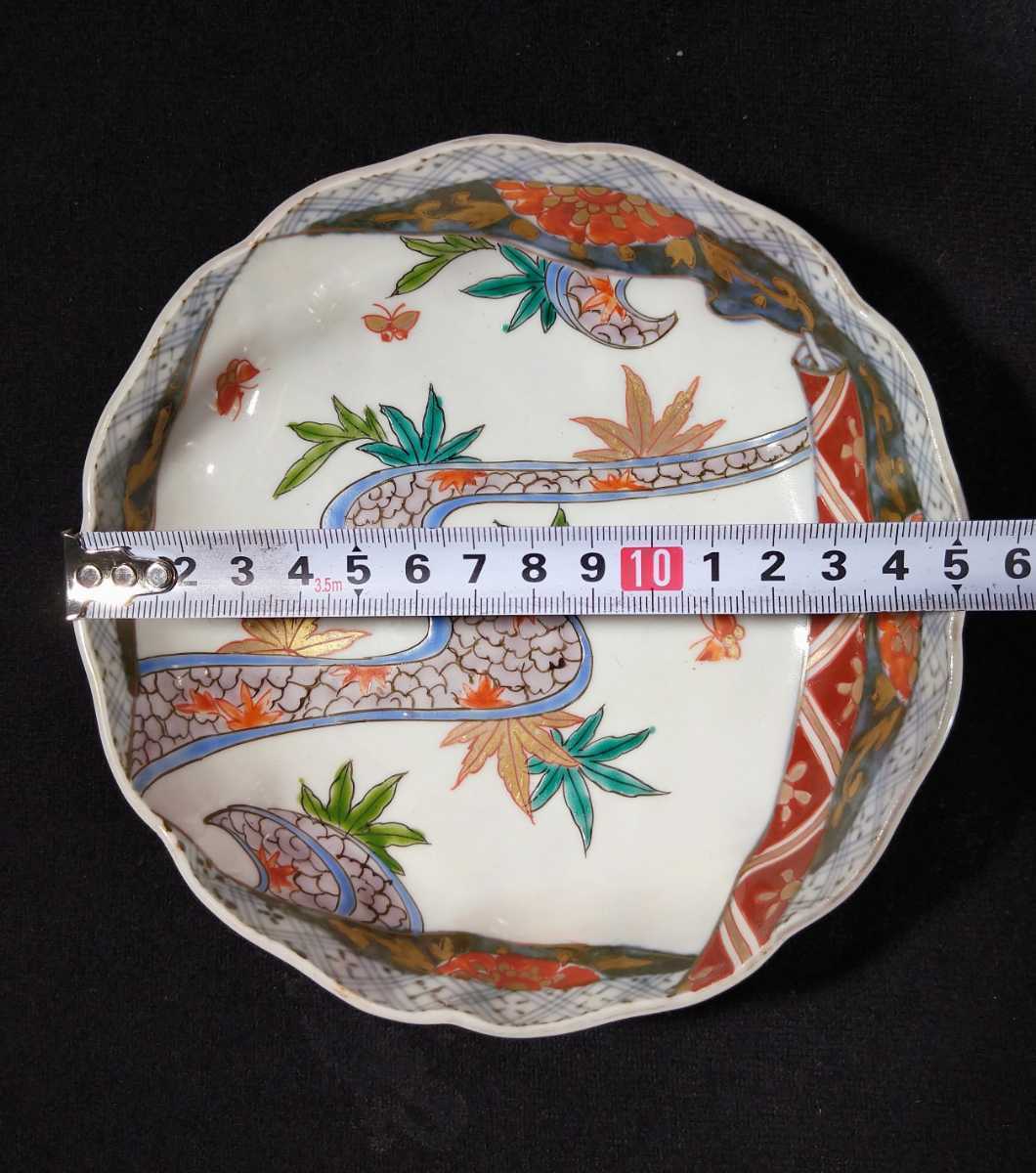 川の流れに紅葉、乱舞する小さな蝶が描かれている美しい膾皿でございます。素人採寸で申し訳ございませんが、径15.4cm、高さ5.0cmでございます。