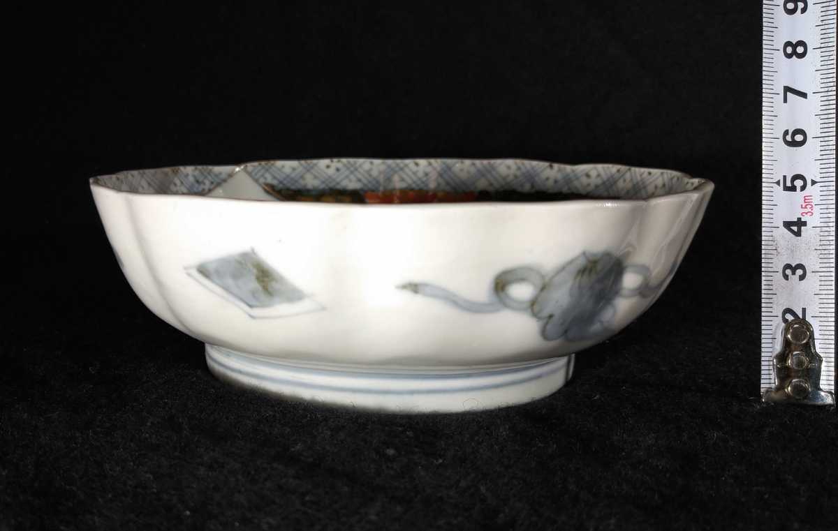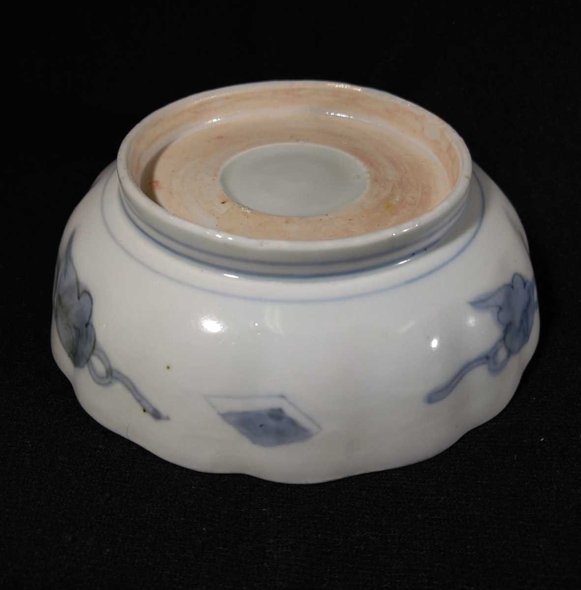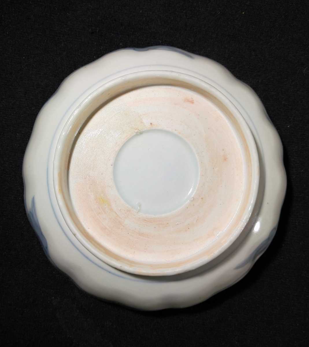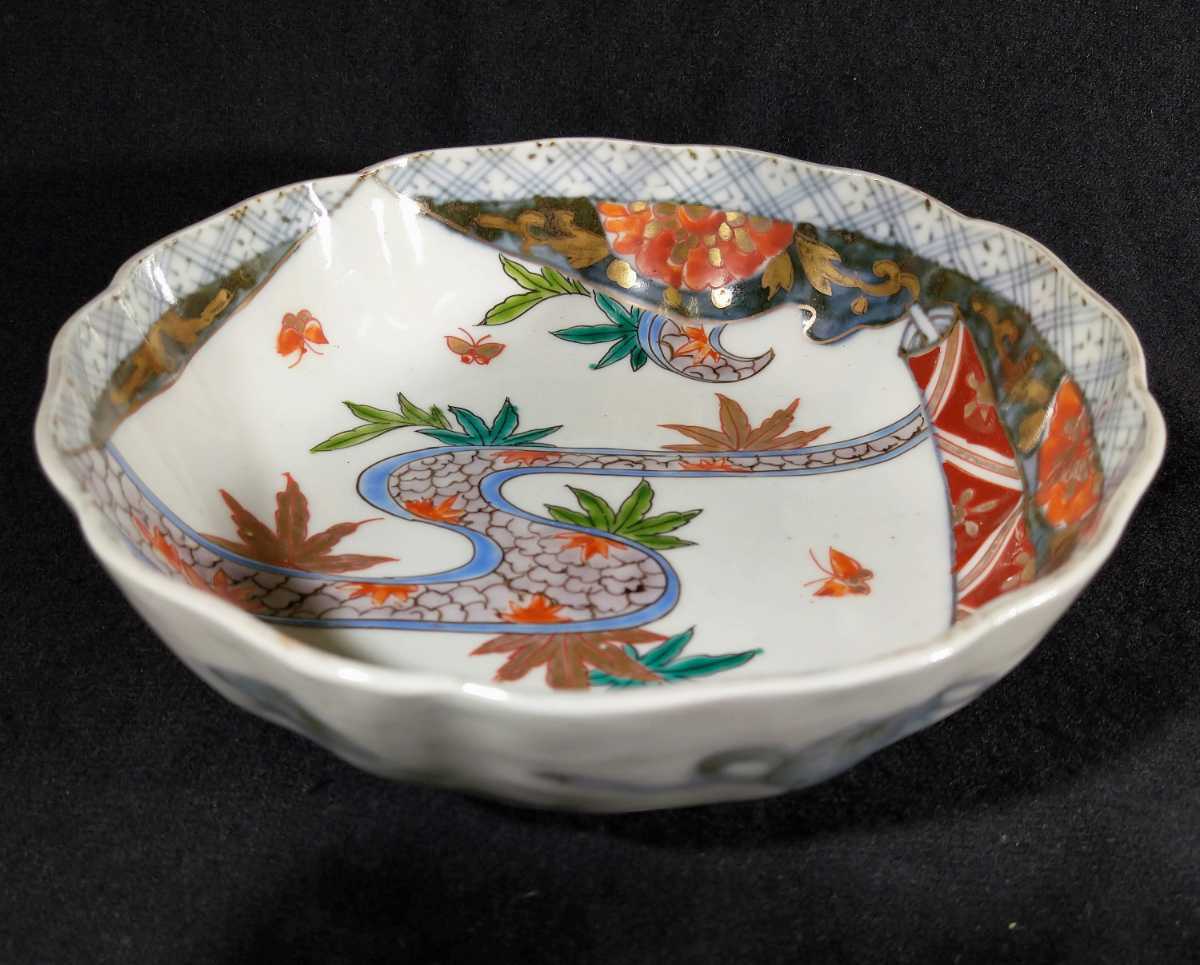 川の流れに紅葉、乱舞する小さな蝶が描かれている美しい膾皿でございます。素人採寸で申し訳ございませんが、径15.4cm、高さ5.0cmでございます。