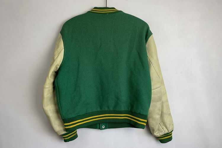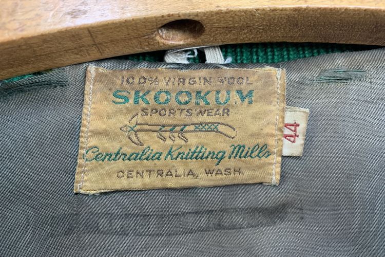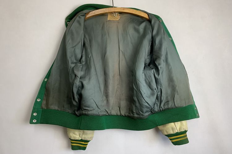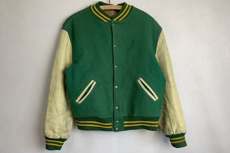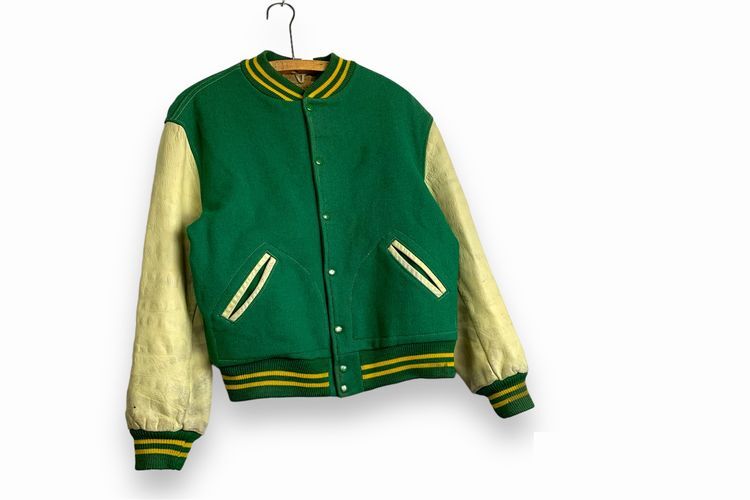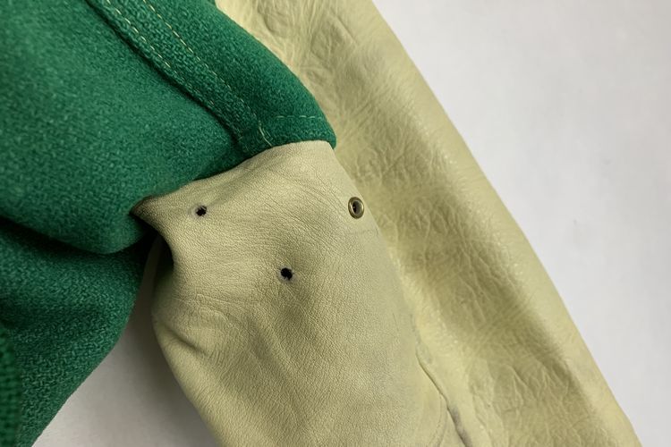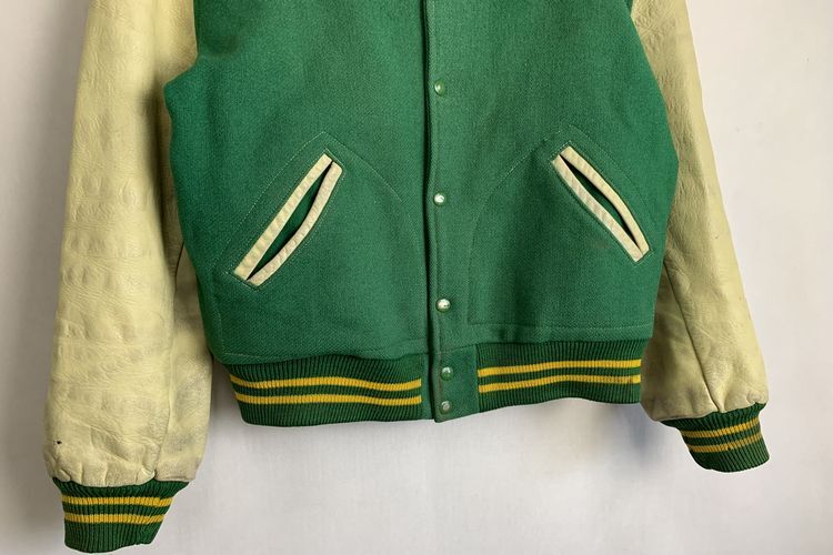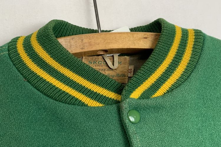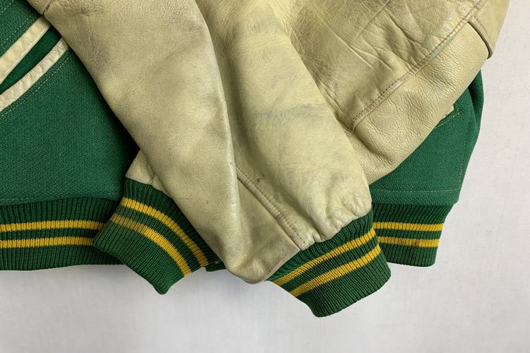 BOROボロスタイル~70sビンテージSKOOKUMスクーカムウール×レザーアワードジャケット44グリーン×アイボリースタジャンアメカジnr24886