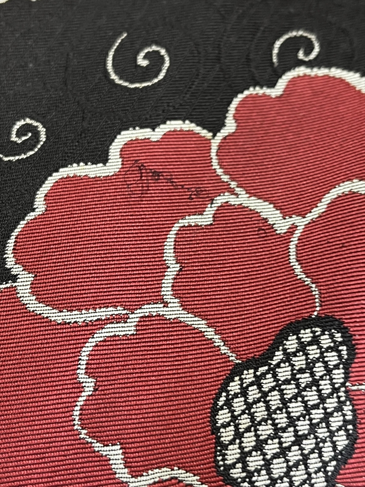 牡丹に渦巻きのユーモラスなデザインの、絽の本袋帯です。