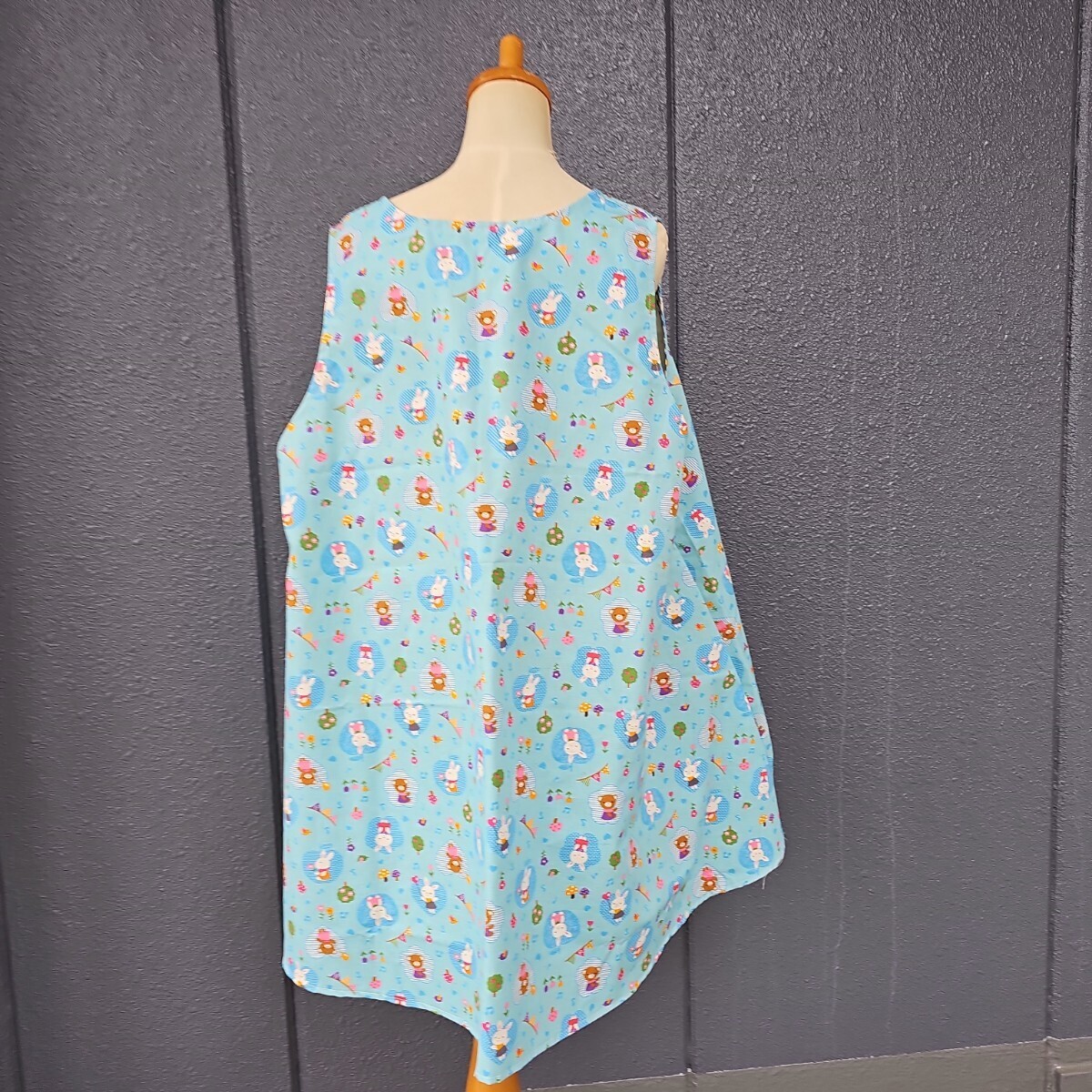 金具、紐が無いので保育士さん、介護士さんにも着用出来ると思います。裾に向かって広がりがあるので、妊婦さんも着用出来るかと思います。