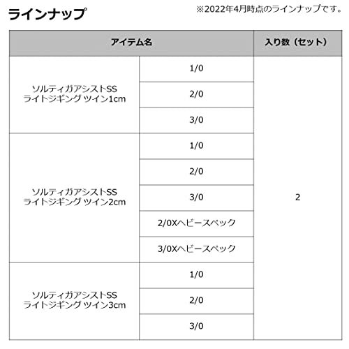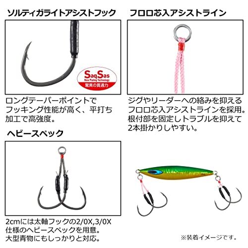 ・ 3cm ♯1/0 07312947・・Size:3cm ♯1/0・アシストライン(cm):3・フックサイズ:#1/0 / 針線経(mm):1.25・自重(g):約1.3・目安ジグサイズ:ライトジギング対応の80~200g相当のジグ・入数:2説明 リーダーやジグに絡みにくく掛けた魚を逃がさないツインタイプのアシストフック。リーダーやジグに絡みにくいフロロ芯入アシストライン。絡みを抑えて2本掛かりしやすい根付部セキ糸巻き。驚異の貫通力サクサスフック。