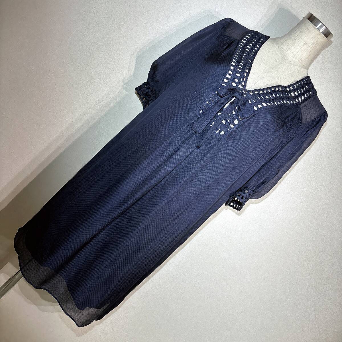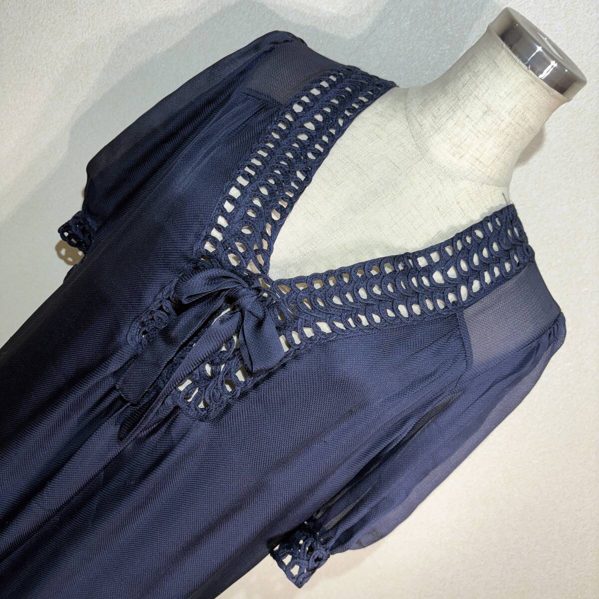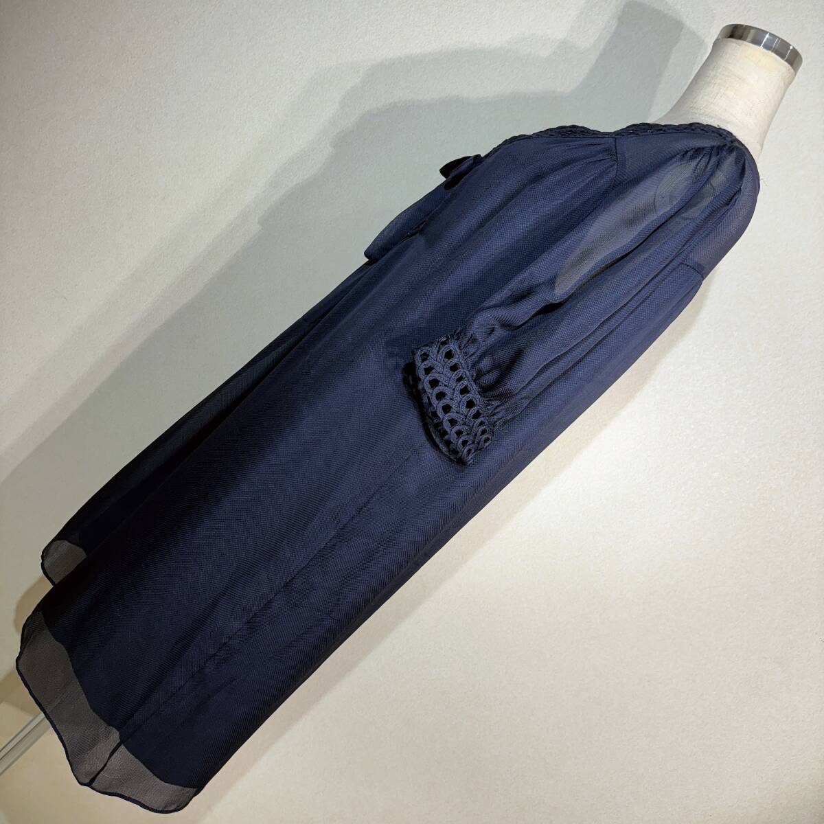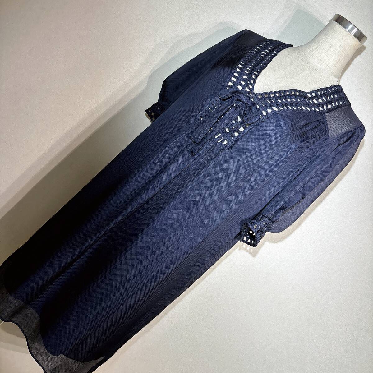 B875■MillyミリーNY★USA製★シルク100%/濃紺/シフォン&レース★5分袖ワンピース■2 | ||||||||||||||||||||