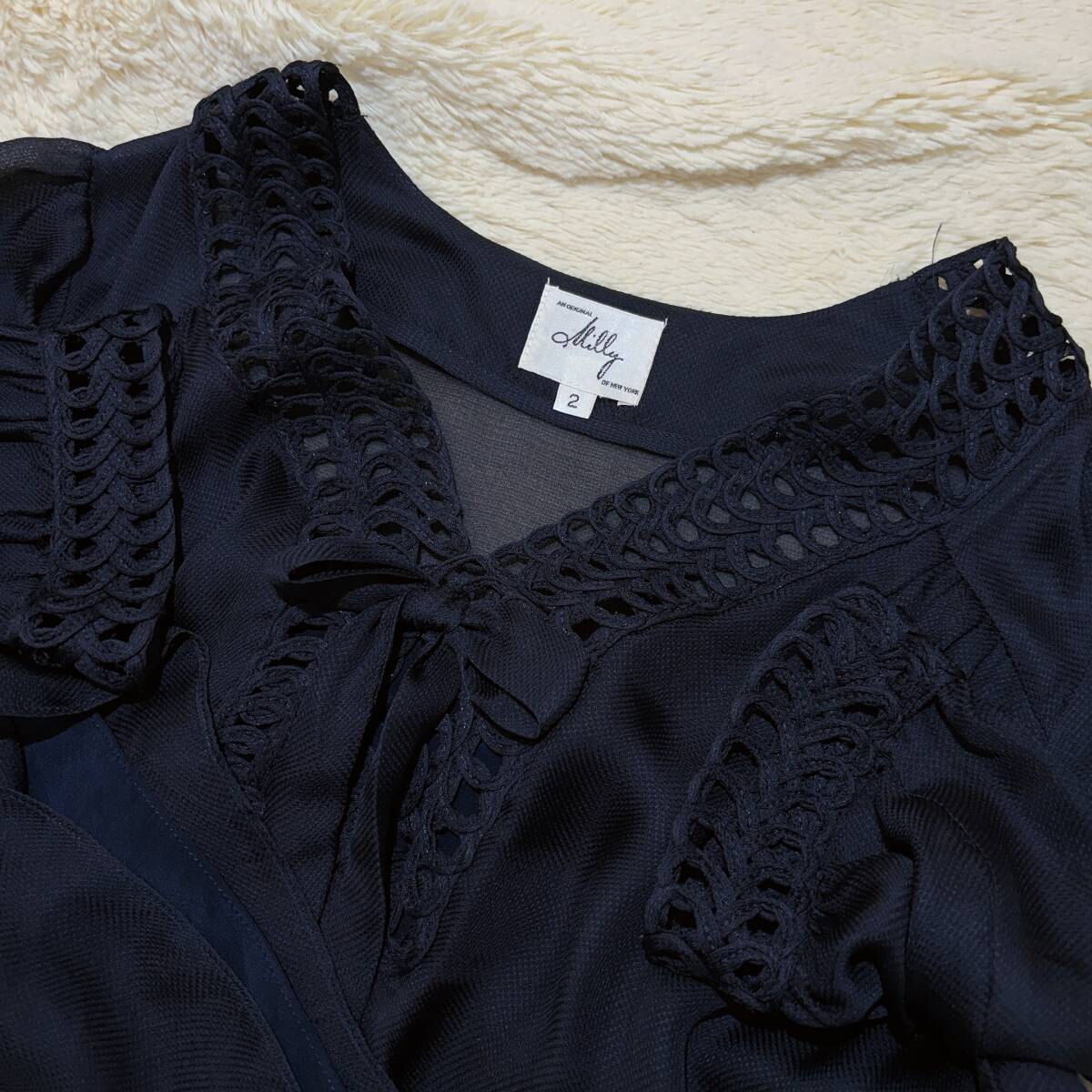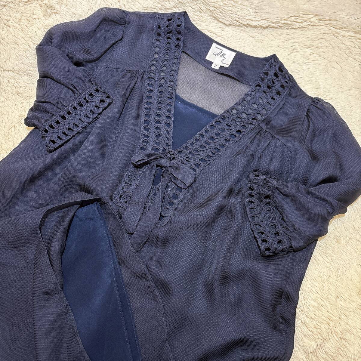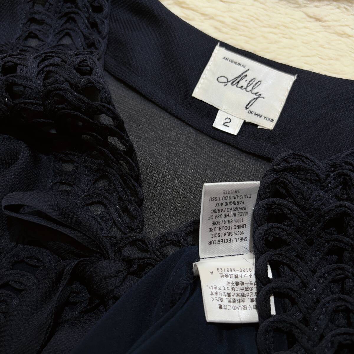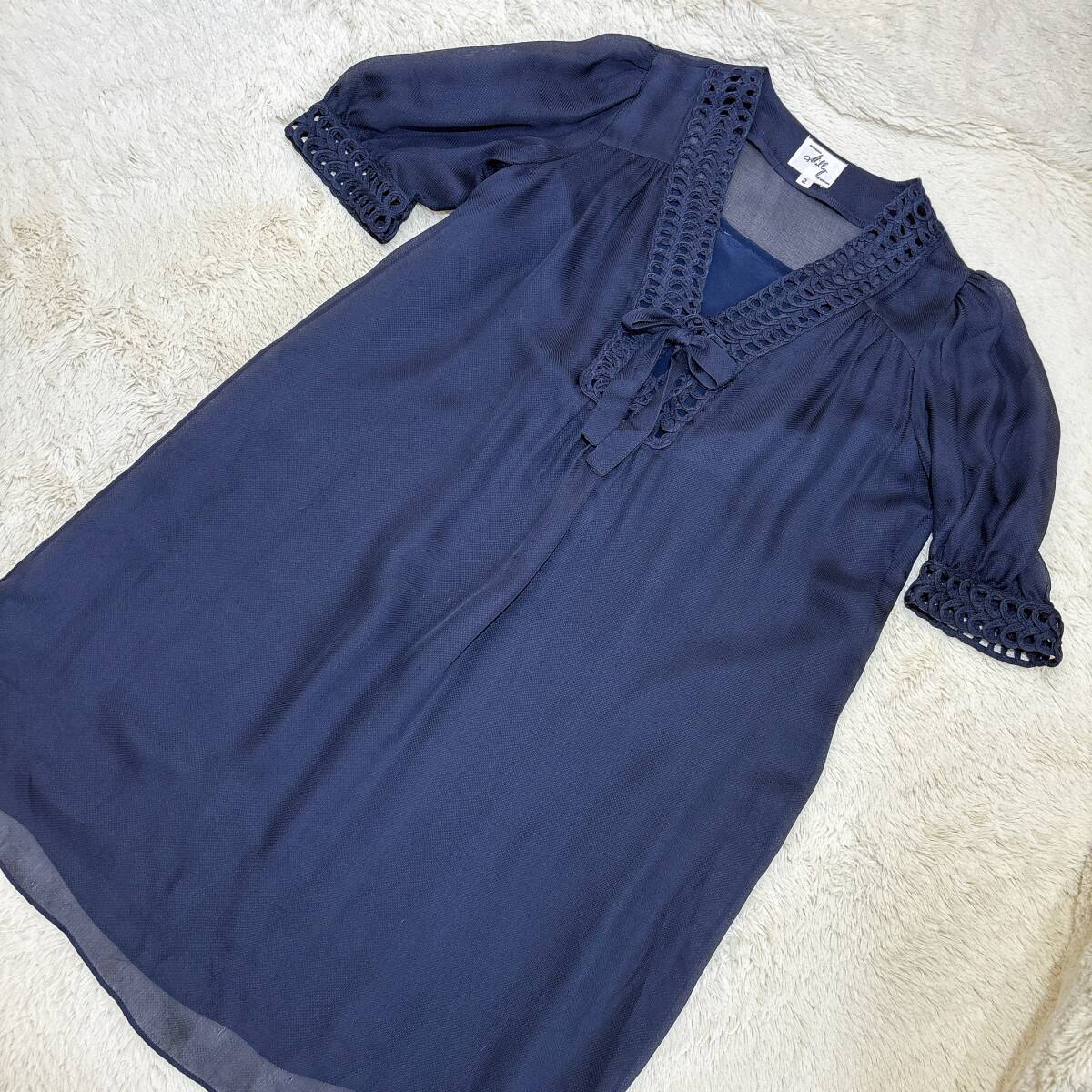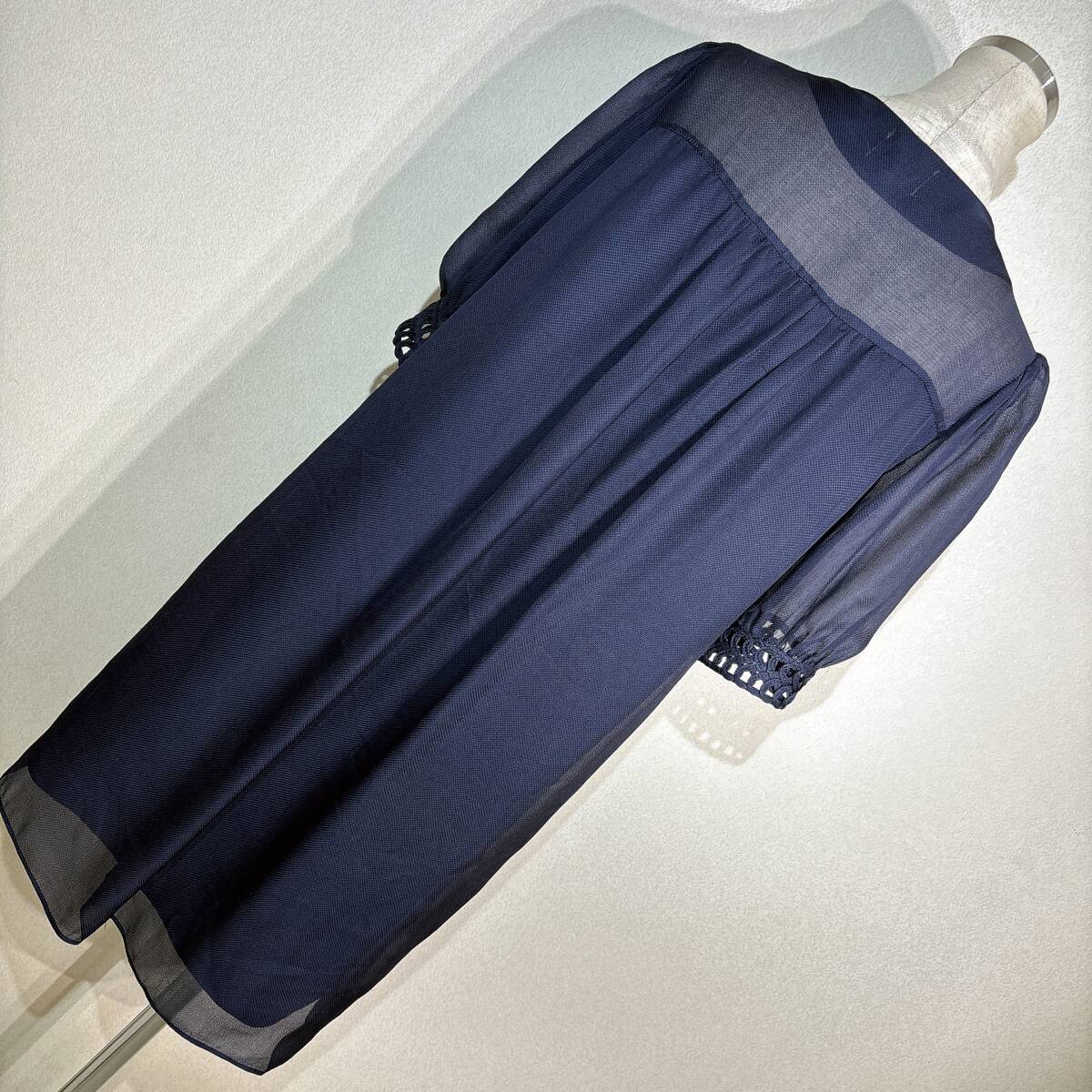 B875■MillyミリーNY★USA製★シルク100%/濃紺/シフォン&レース★5分袖ワンピース■2 | ||||||||||||||||||||