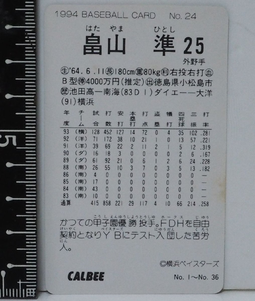 94年 カルビー プロ野球カード No.24【畑山 準 外野手 横浜ベイスターズ】平成6年 1994年 当時物 Calbeeおまけ食玩BASEBALL【中古】送料込