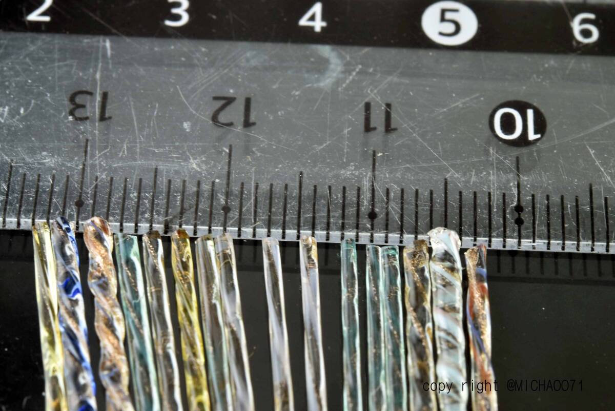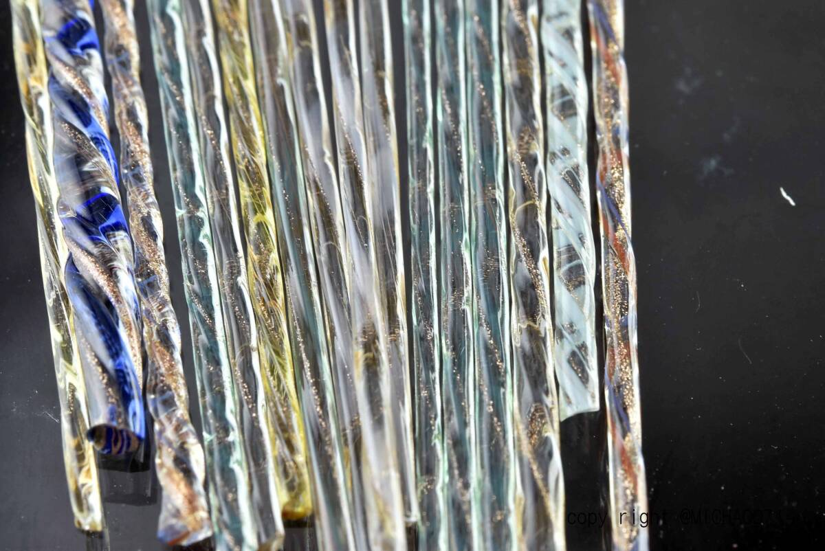 モレッティの細く細密なツイストガラス棒、ガラスレース棒は、アクセサリー小物作りに最適です。このレース棒は約5cmの長さで(太さは写真)、ペンダント、ピアス、イヤリング、指輪、ブローチ、ピンバッジ、帯留めなどのアクセサリーの材料として使われます。 トンボ玉や万華鏡制作にも最適です。
