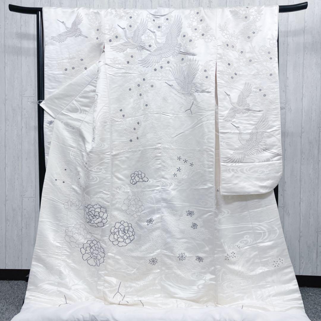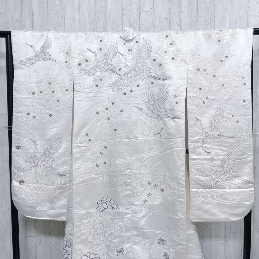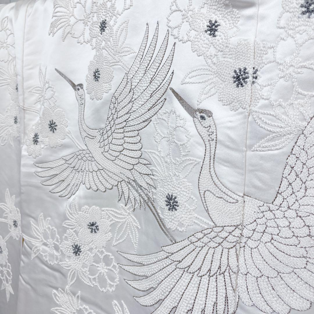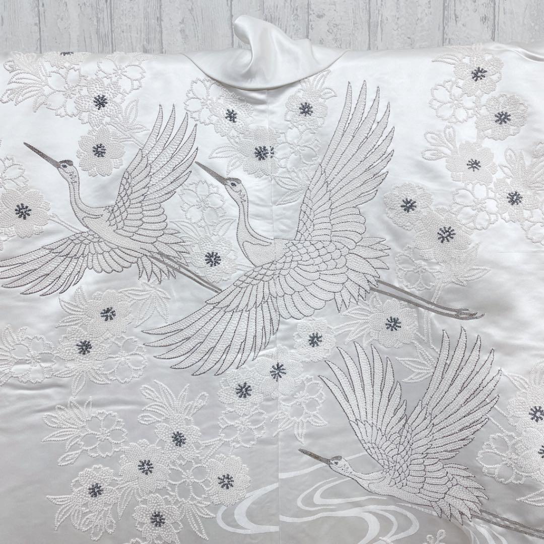 一面純白の生地に、相良刺繍で桜と鶴がふんだんにあしらわれています。
