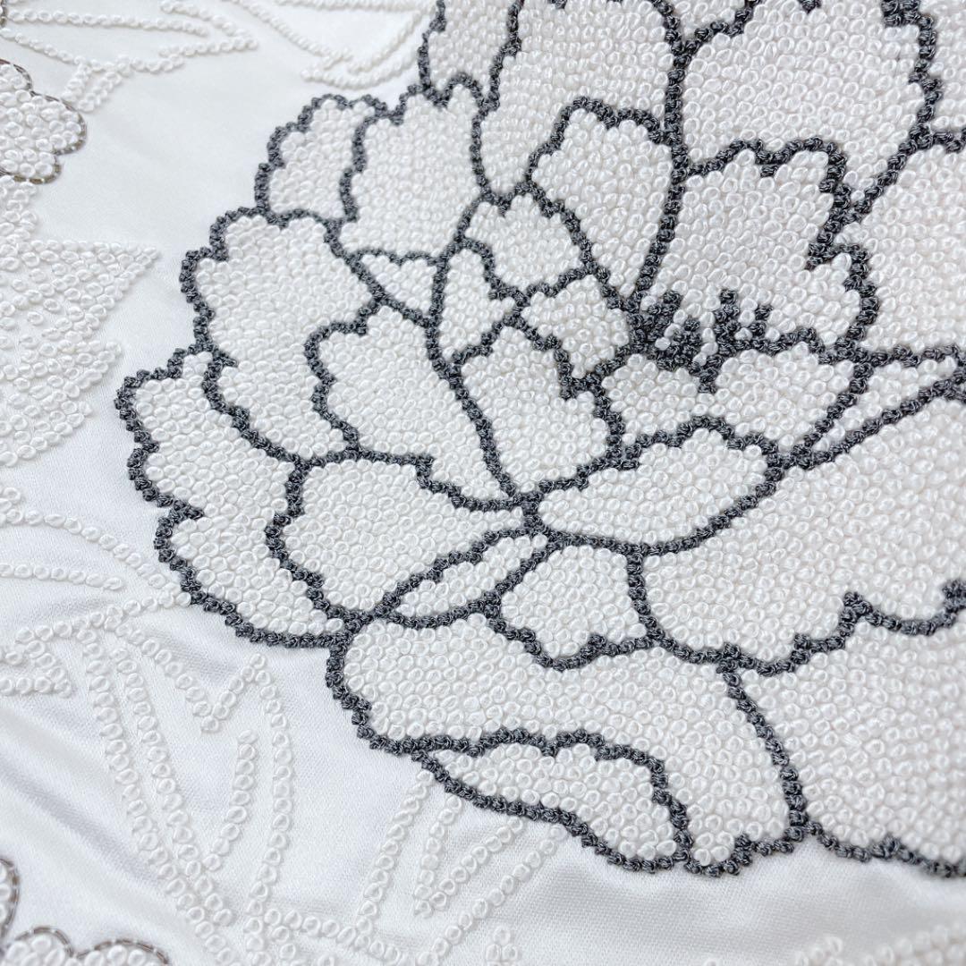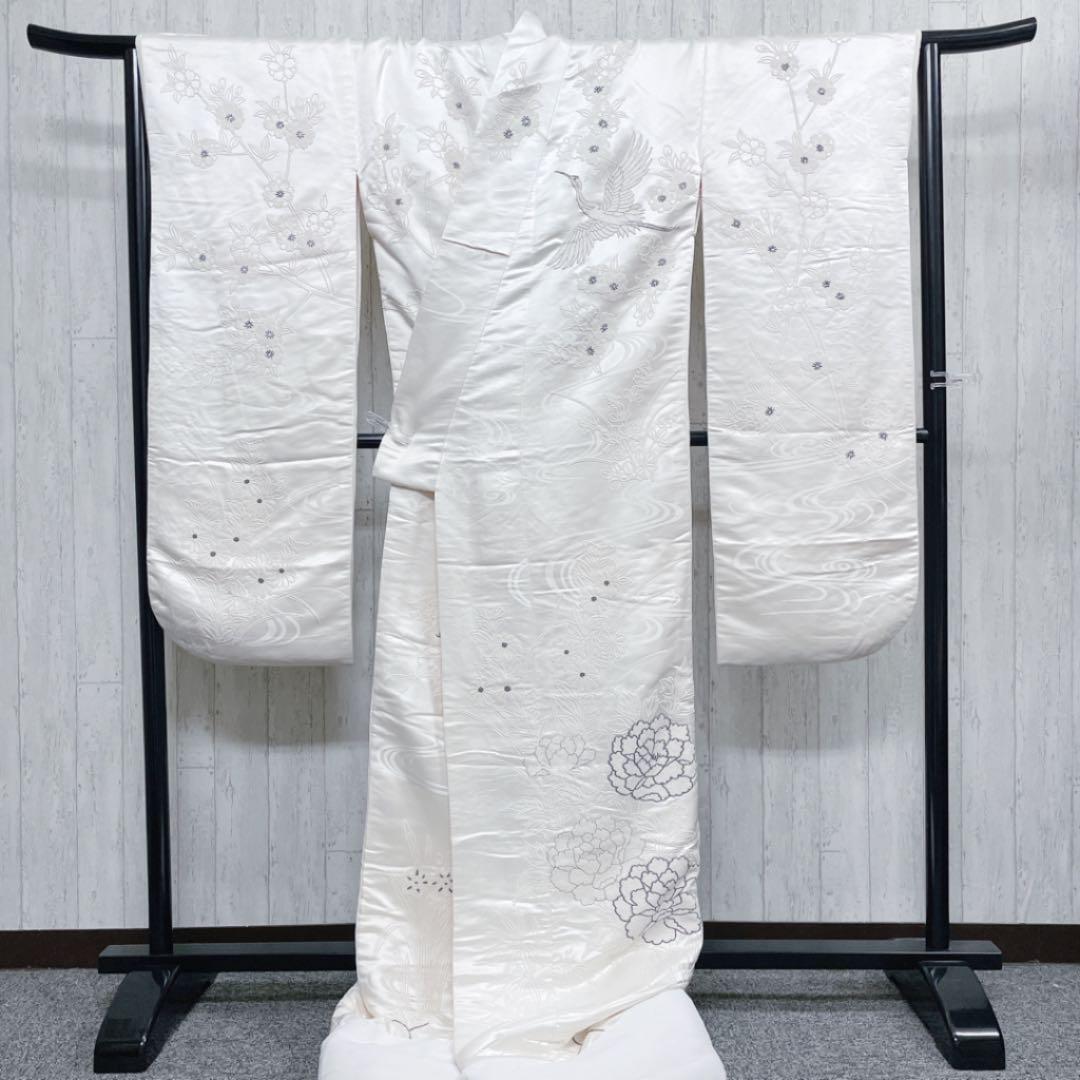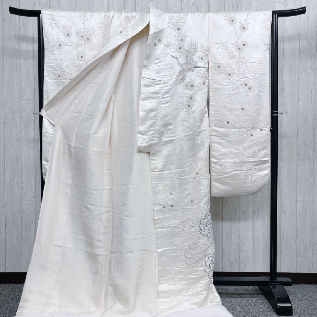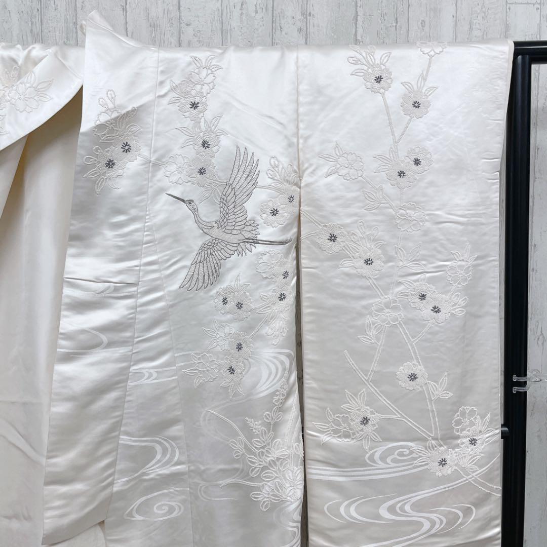 一面純白の生地に、相良刺繍で桜と鶴がふんだんにあしらわれています。