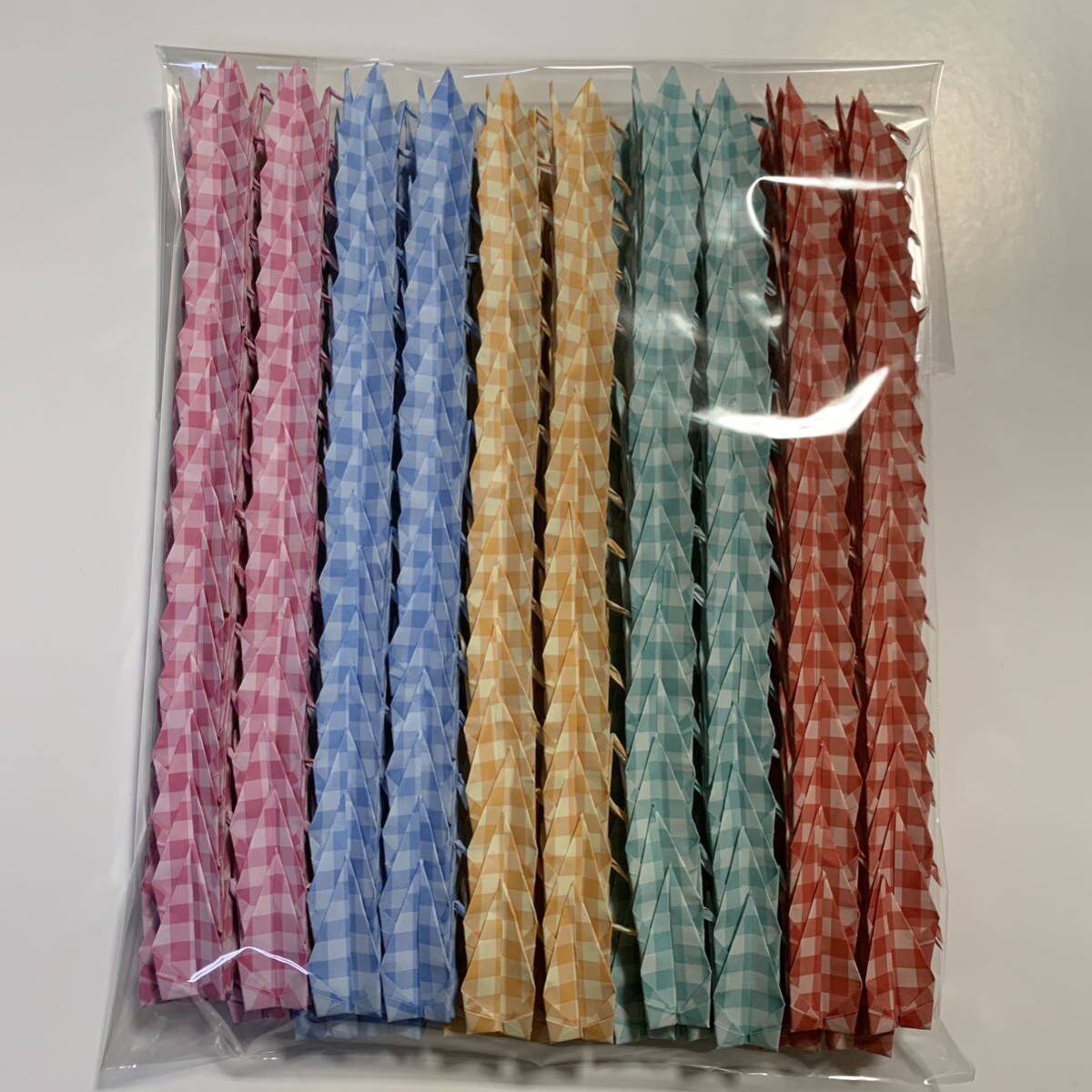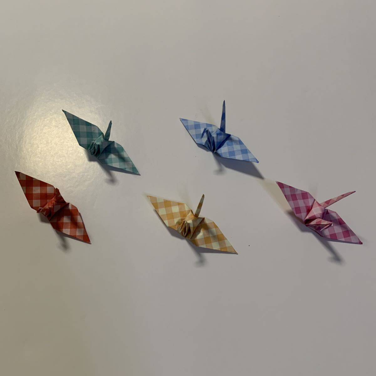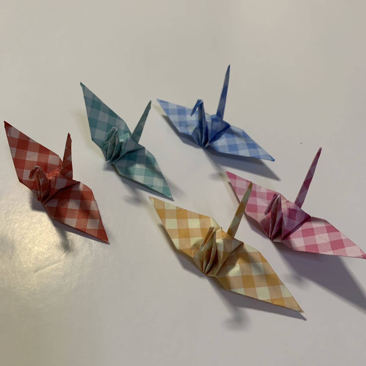 5種類の、チェック柄の折り紙で作った折り鶴です。