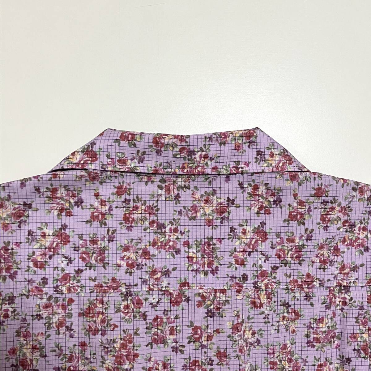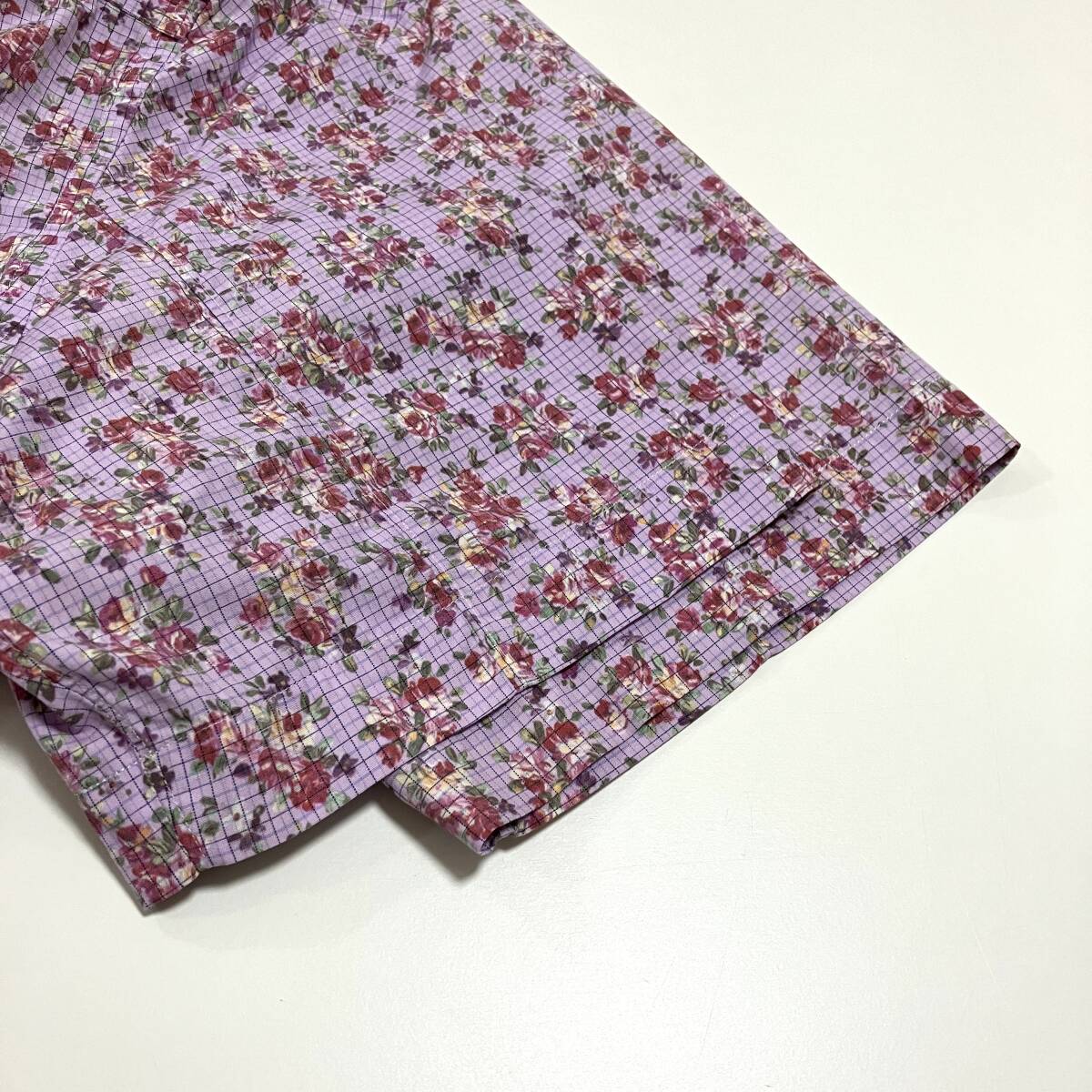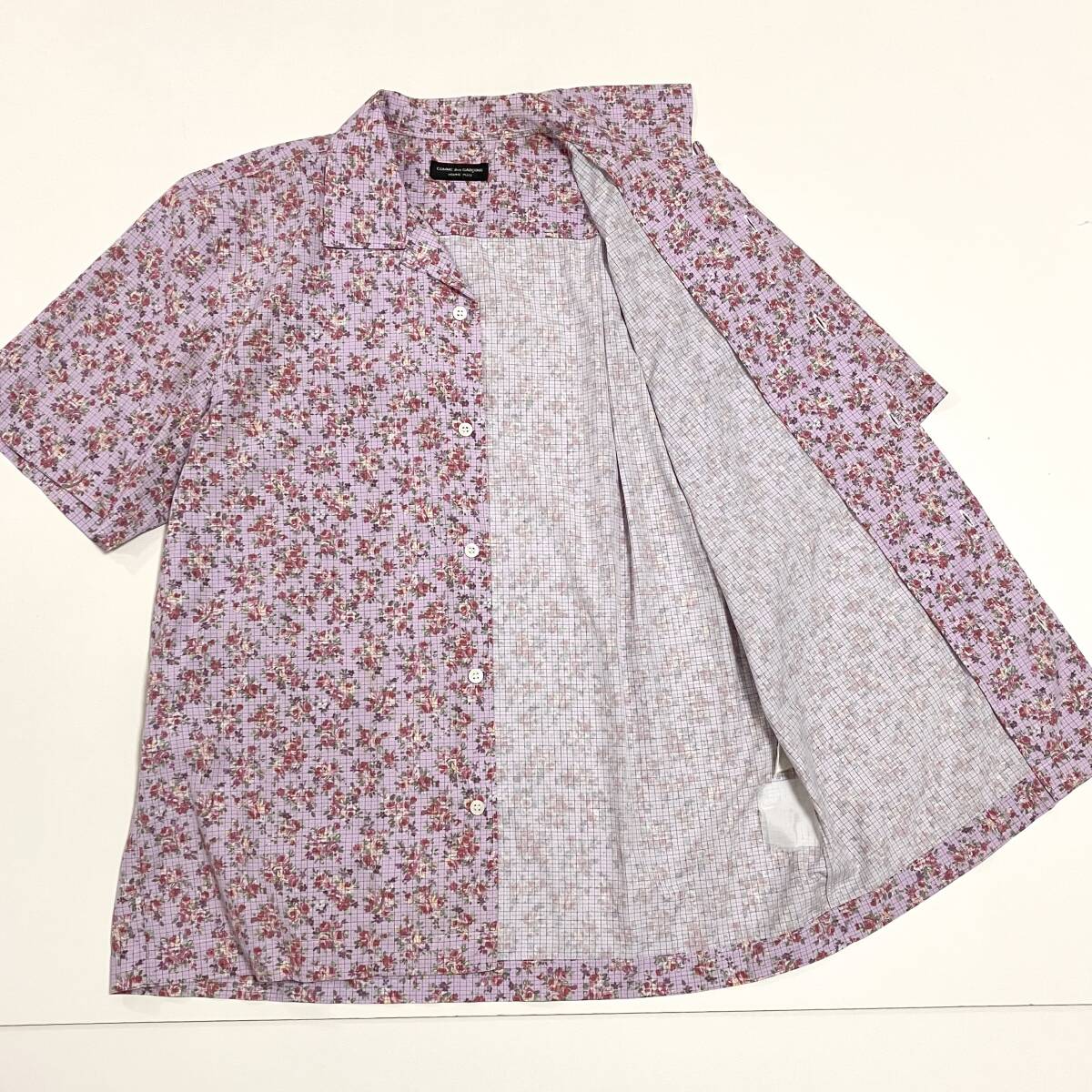 80s 90s コムデギャルソンオムプリュス 花柄 チェック 半袖 オープンカラー シャツ パープル系