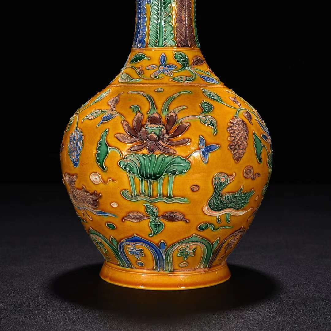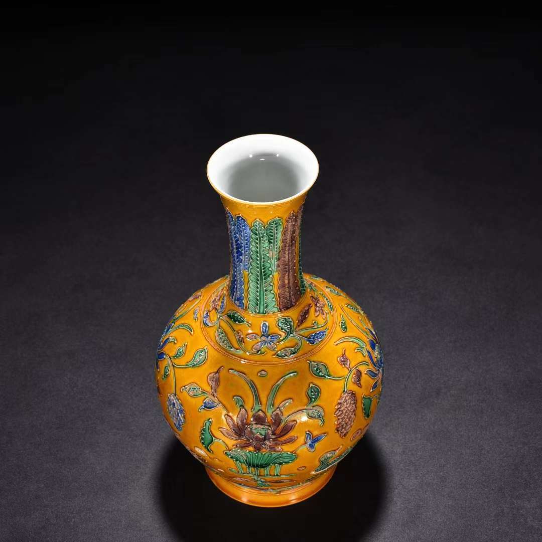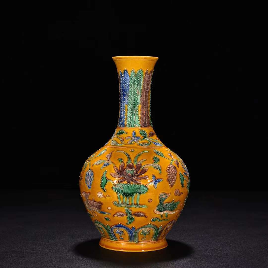 明時代 成化 嬌黄釉 琺華彩 蓮池鴛鴦紋瓶 唐物 中国美術 工芸品 高さ22.5cm 直径13.5cm【HB691】