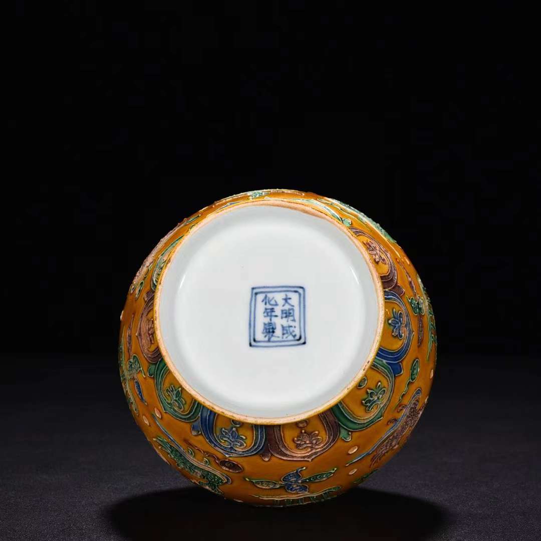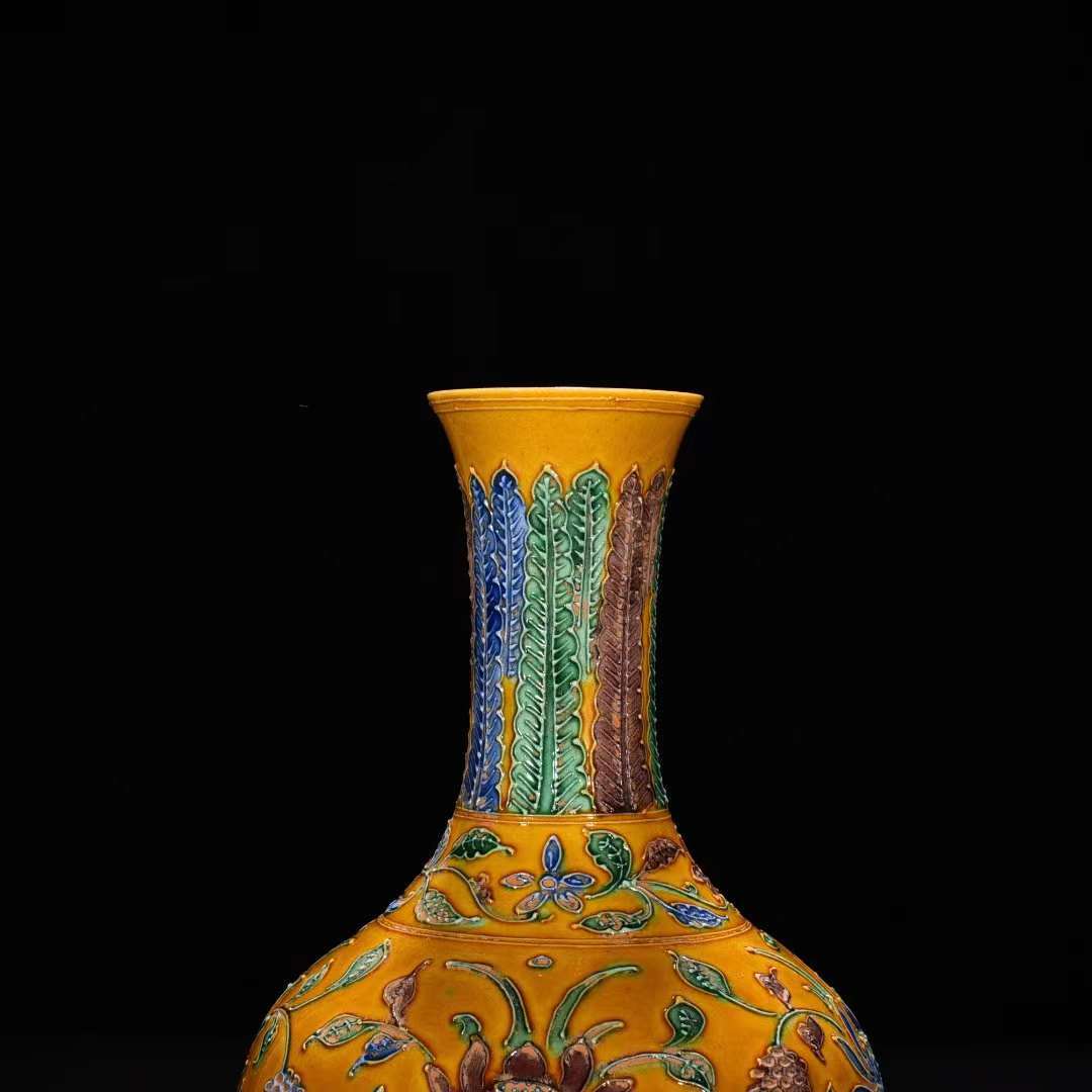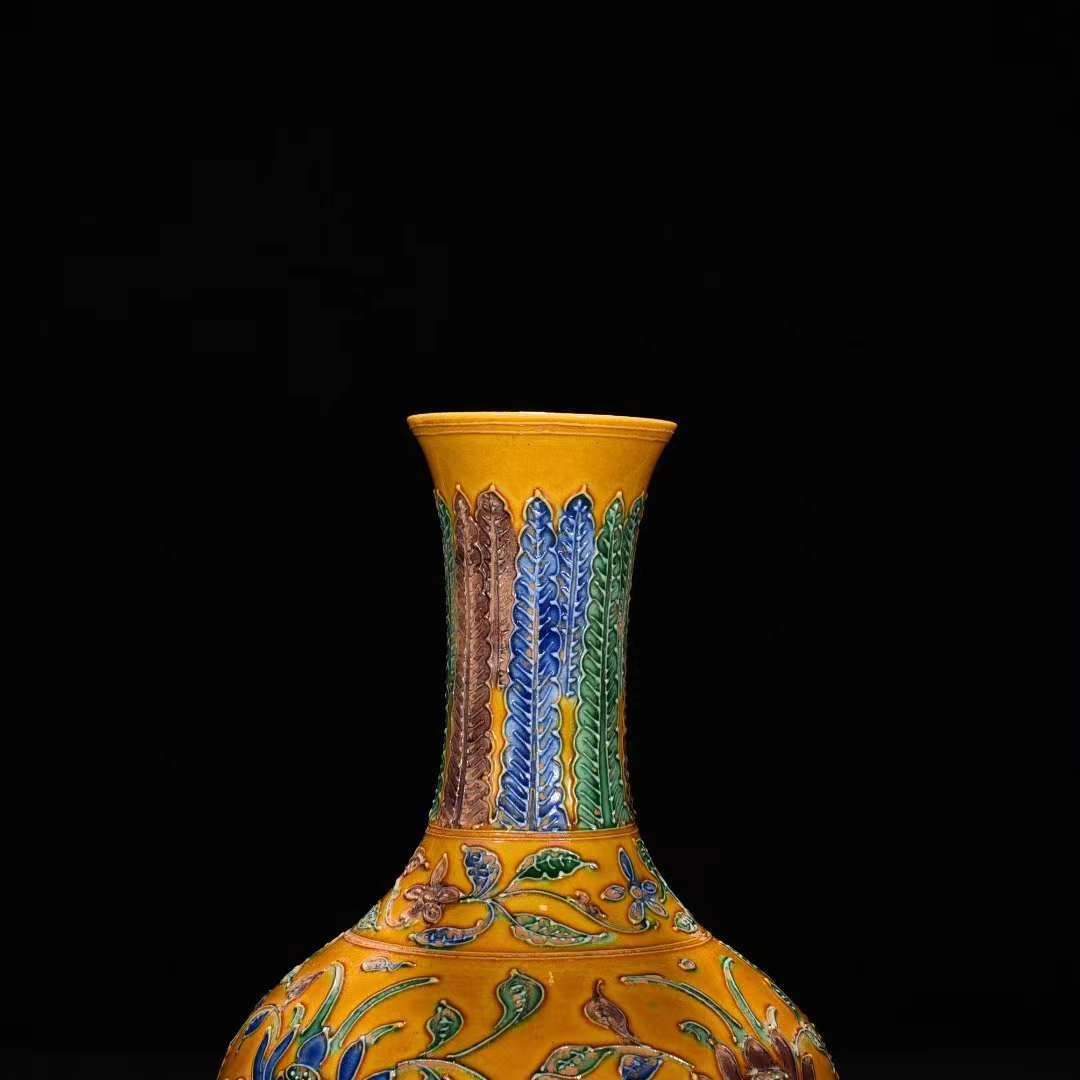 明時代 成化 嬌黄釉 琺華彩 蓮池鴛鴦紋瓶 唐物 中国美術 工芸品 高さ22.5cm 直径13.5cm【HB691】