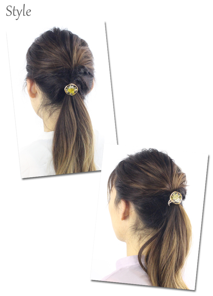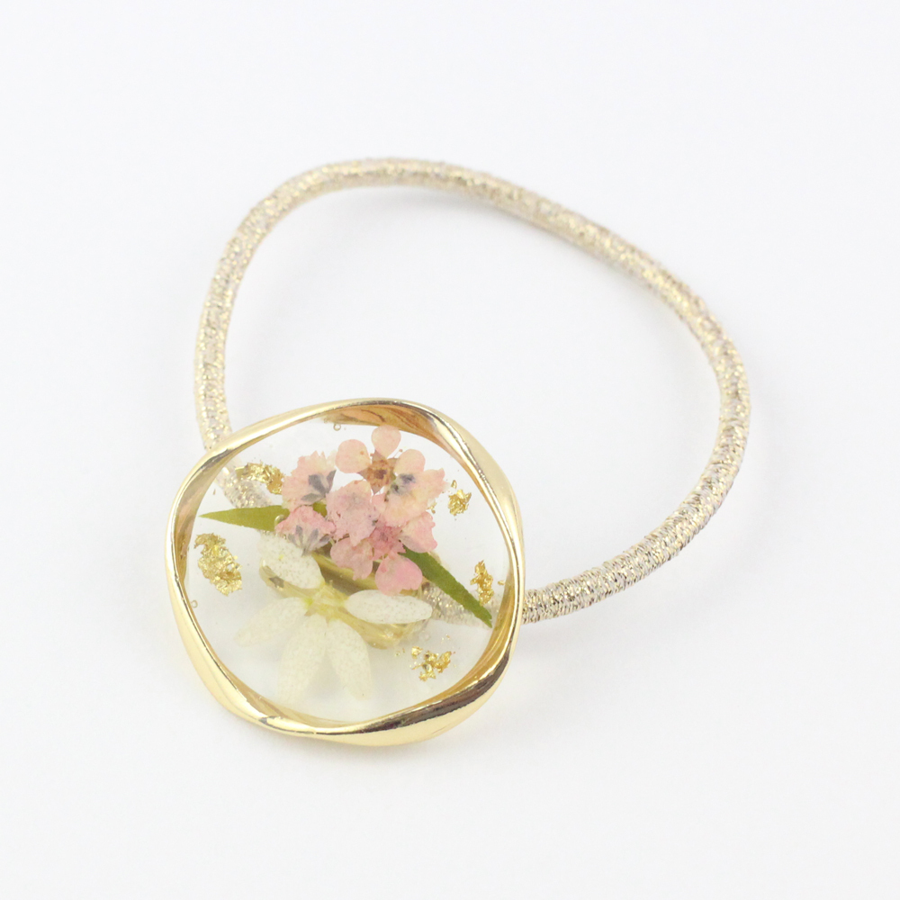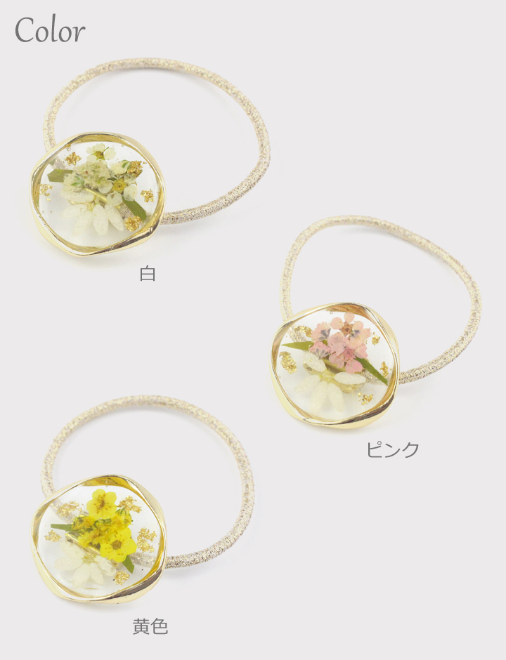 商品説明 | 透明感のあるレジン風のお花モチーフが春夏のファッションにぴったり! ヘアゴム部分はラメ色ゴールドベージュとなっており明るい印象に☆ 普段使いからおでかけシーンまで、幅広く使えるアイテムです。 |