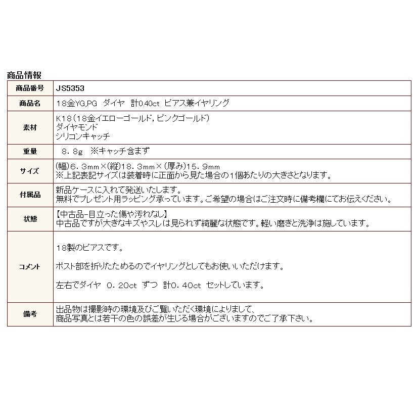| 商品名 | 18金YG,PG ダイヤ 計0.40ct ピアス兼イヤリング |