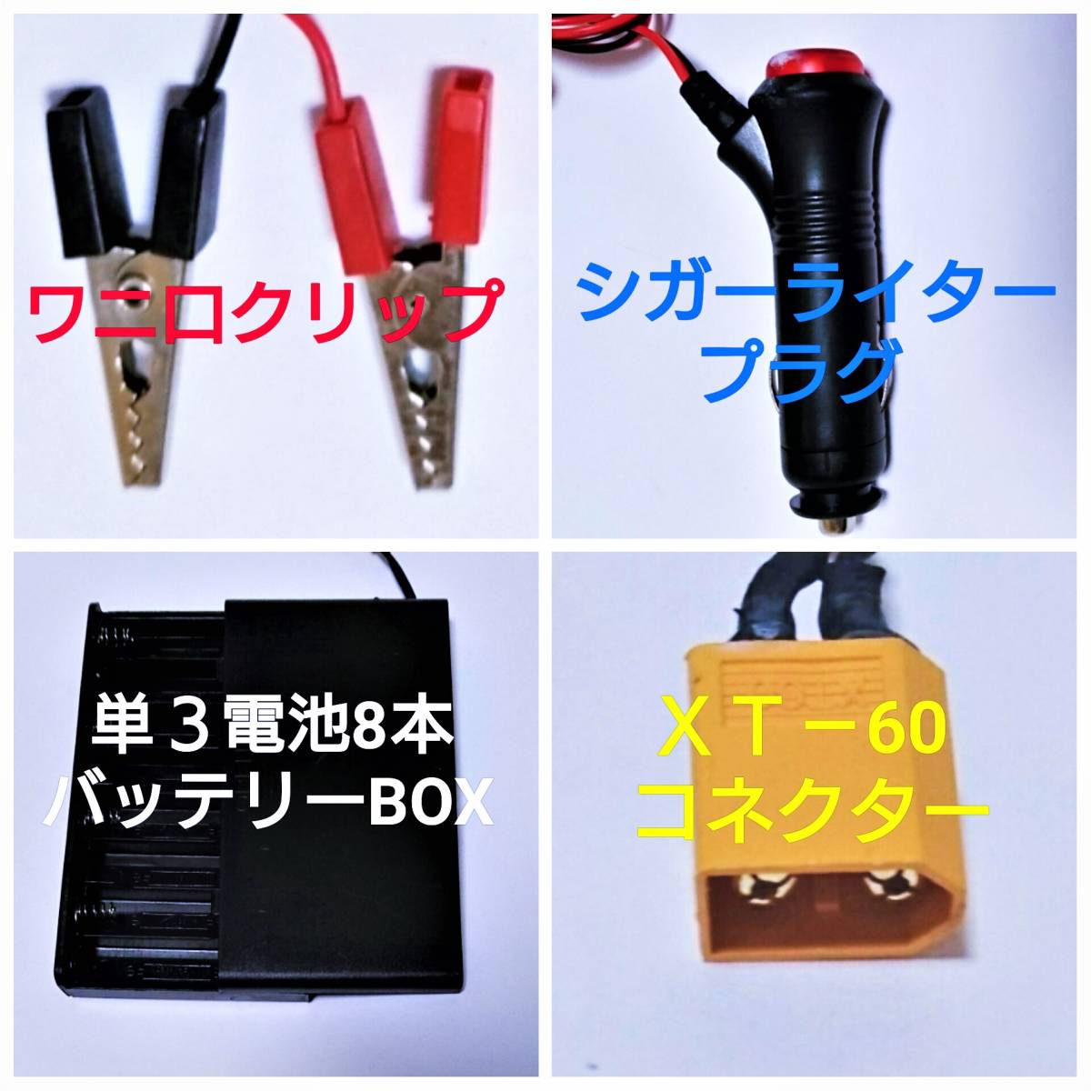 電源:ワニ口クリップ、XT-60、シガーライタープラグ、バッテリーBOX(単三8本)
