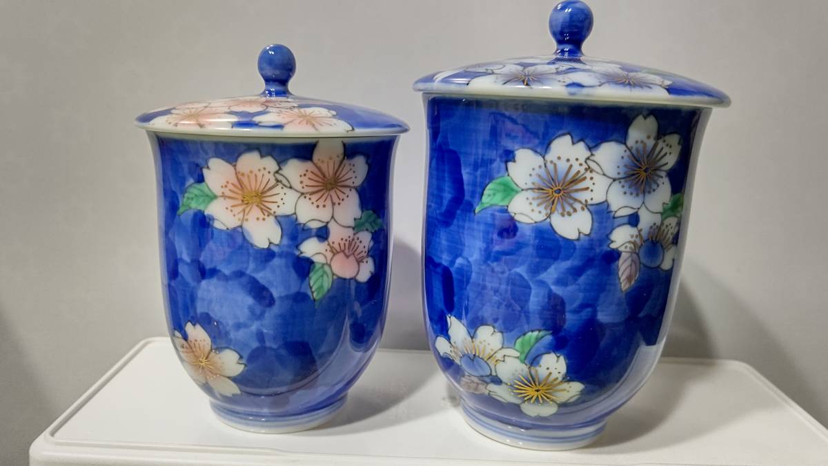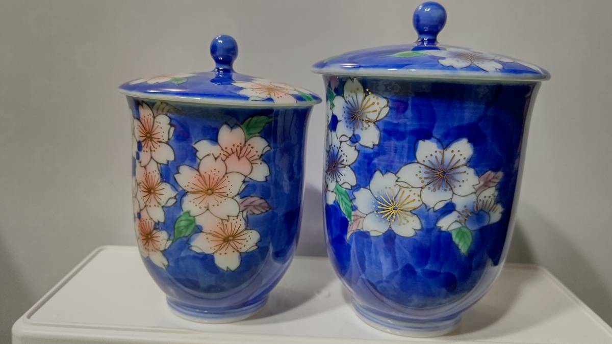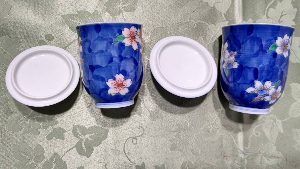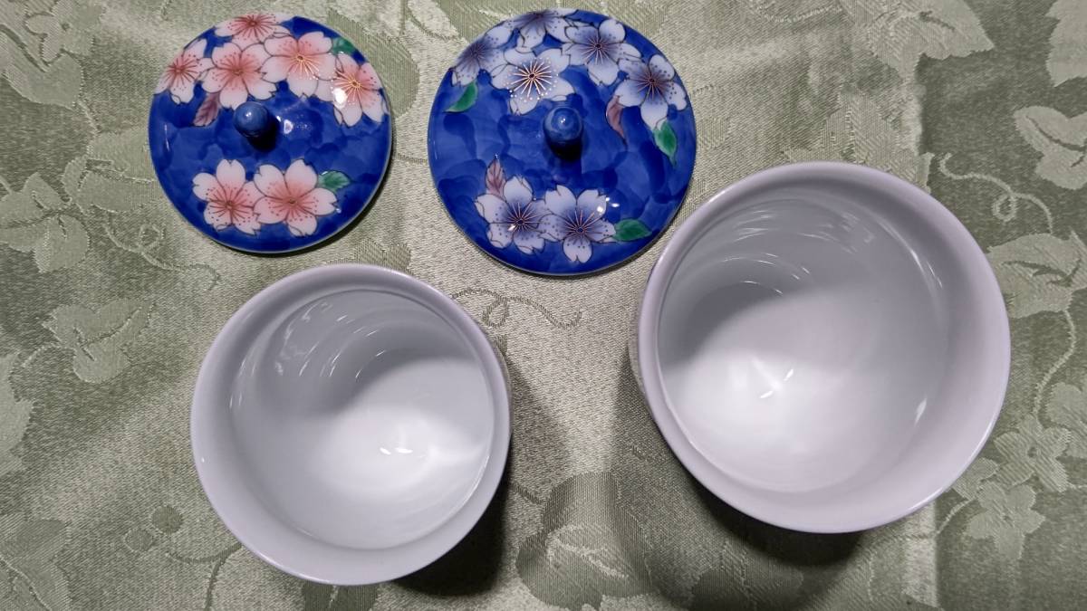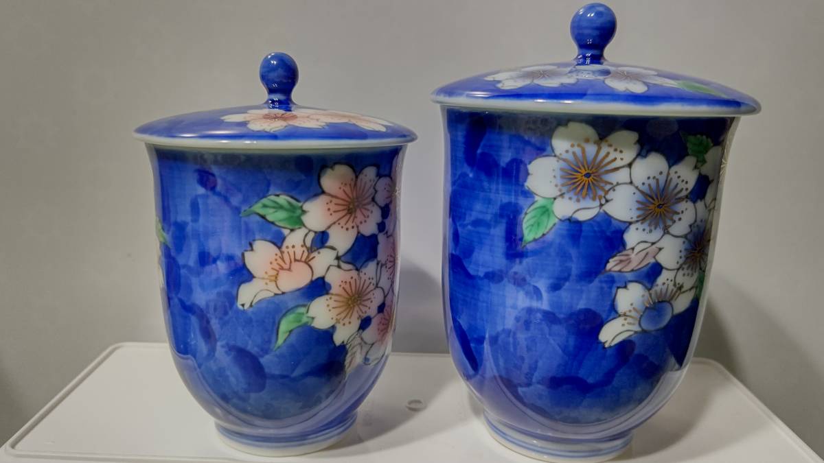 宮内庁御用達 深川製磁 蓋付き夫婦湯み茶碗(7.2×11㎝&6.5×9.5㎝)桜花模様 美品