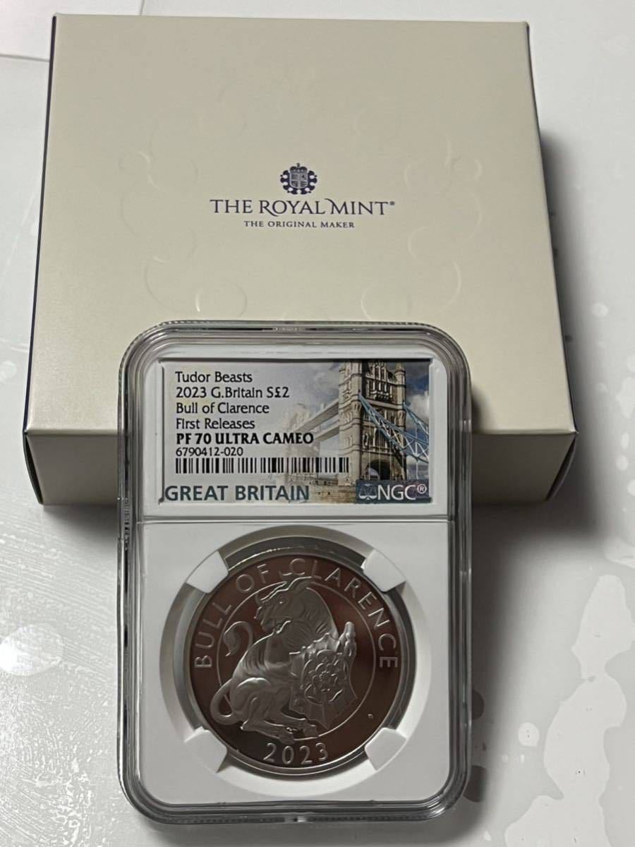 この2023年 英国 2ポンド 1オンスRoyal Tudor Beasts Collection Bull of Clarenceプルーフ銀貨は、発売後30日以内にNumismatic Guaranty Company(NGC)に提出され、審査を受けました。このコインは、その完璧なストライク、完璧な表面、見事な目の魅力を表すプルーフ70のグレードを獲得しました。このコインは、NGCファースト・リリースの証明ラベルが貼られた、音波で密封された保護ホルダーに収められています。造幣局ブランドのオリジナル・パッケージとシリアルナンバー入りの真正鑑定書が、鑑定済みのコインと一緒に届きます。