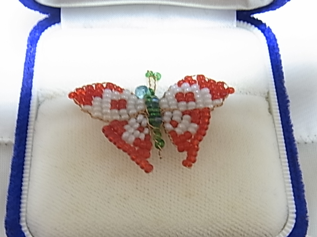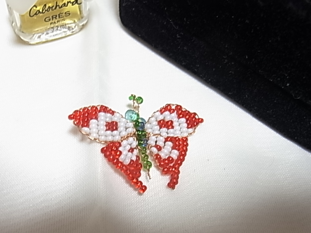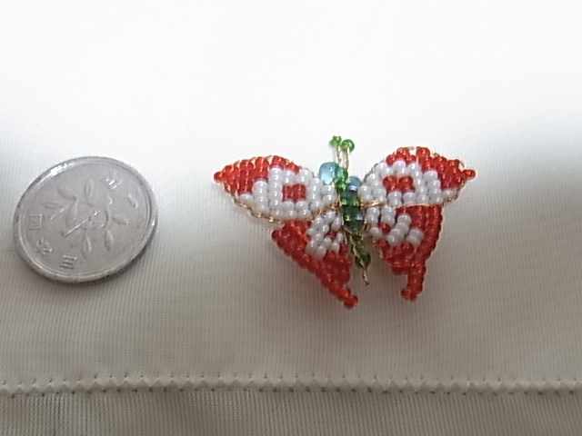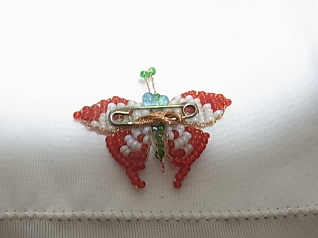 ハンドメイド  蝶々 バタフライのデザイン 赤と白の羽が綺麗 ドールサイズ 3.3×3㎝位 可愛い大きさ ブローチ▲