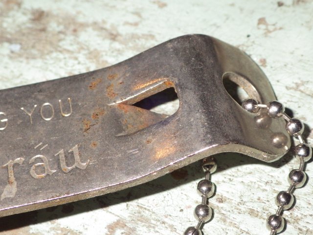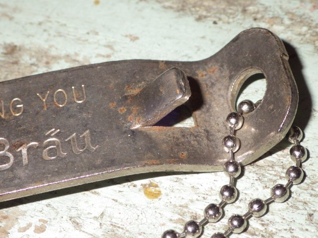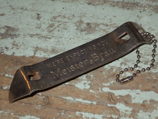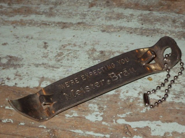日本ではあまり見かけないこのとんがった形、こちらは当時のフラットトップのビール缶を空ける缶切りになっており、逆側は通常の王冠を空ける栓抜きになっております♪