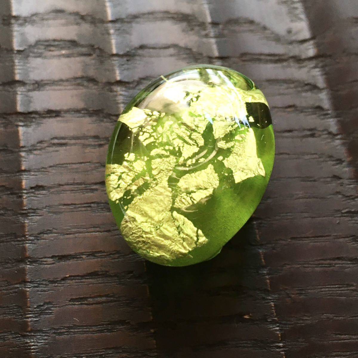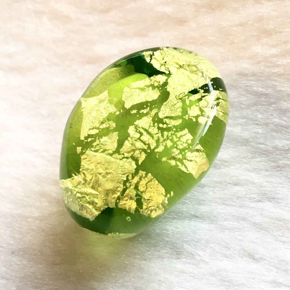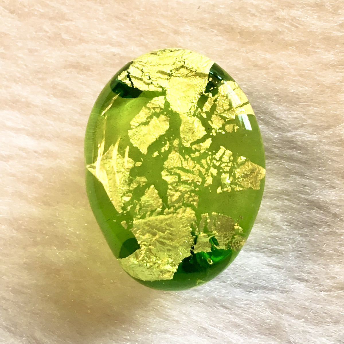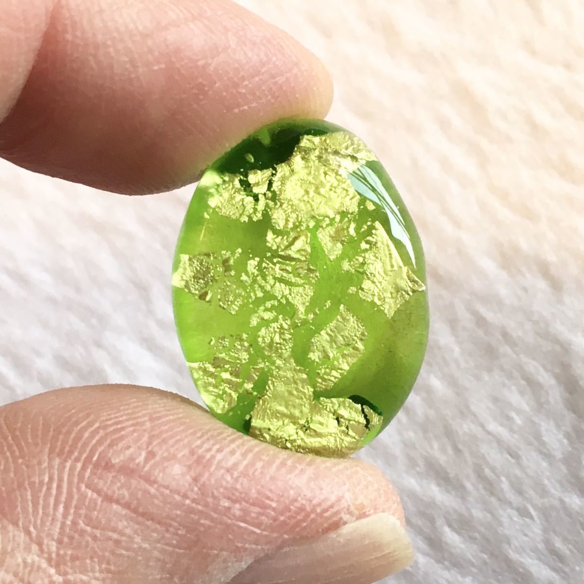 ガラスは二層になっていて、緑色のガラスの表面に銀箔を貼り合わせ、その上から黄緑色のガラスを被せています。