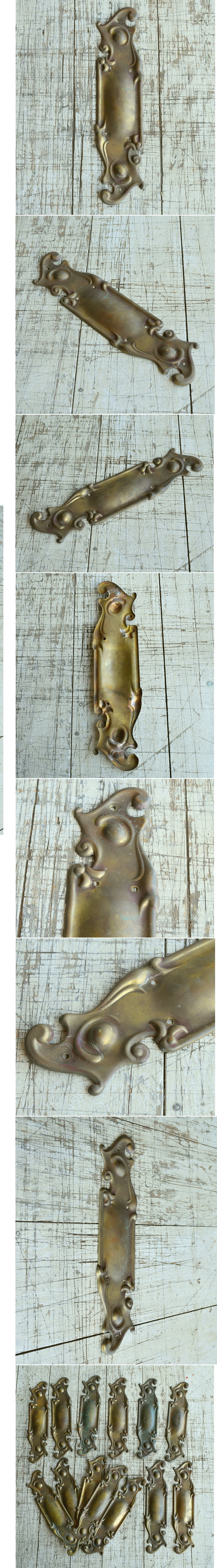 イギリスの蚤の市で見つけてきた古い 真鍮ドアプレート(フィンガープレート)です。 アールヌーボーな形がとても素敵です。薄い材料の割りに歪みがほとんど無いです 。 大きなダメージなくコンディション良好です。 (若干歪んでいるものもありますが、取り付ければ収まります) 年代表記は1930~1950、年代にしておりますが、 おそらく、1900年代初頭のものです。 価格は1個単位です。