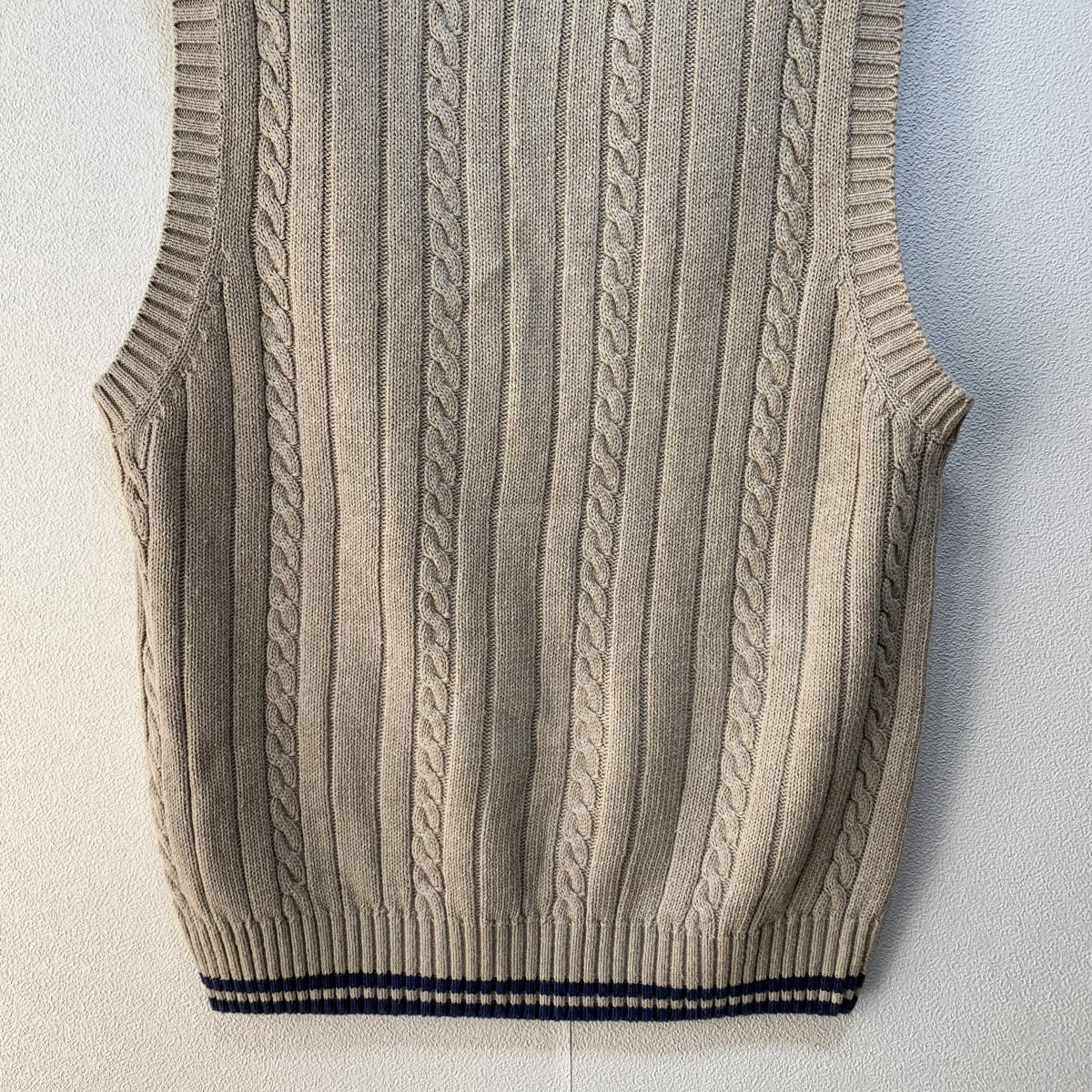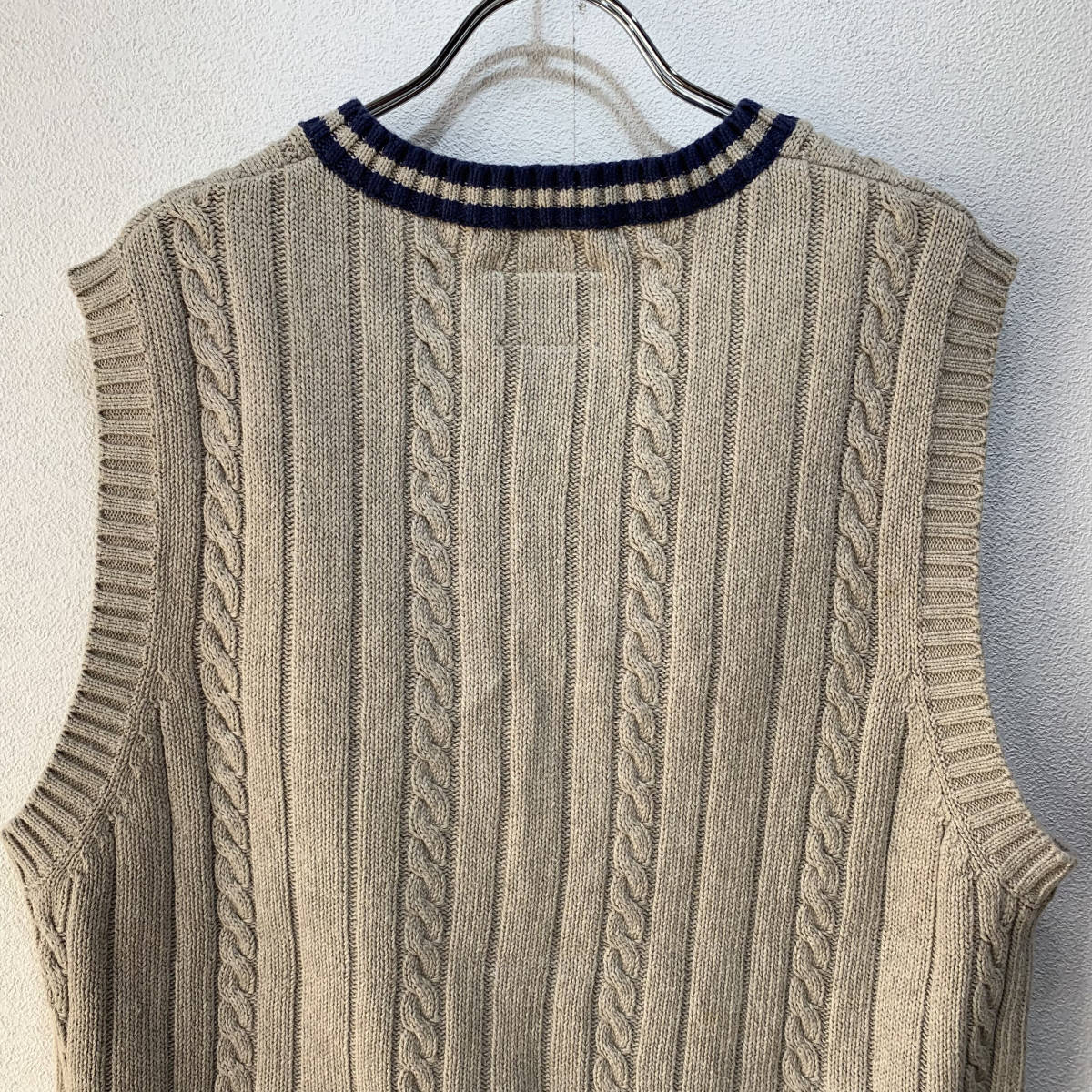 右肩後ろあたりに薄い小さなシミがありますがキレイな状態です 落着きの落着きのあるかつカジュアルなニットベストです 春・秋・冬シーズンに大活躍のアイテムです