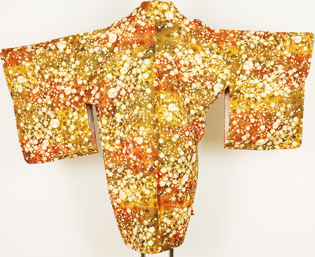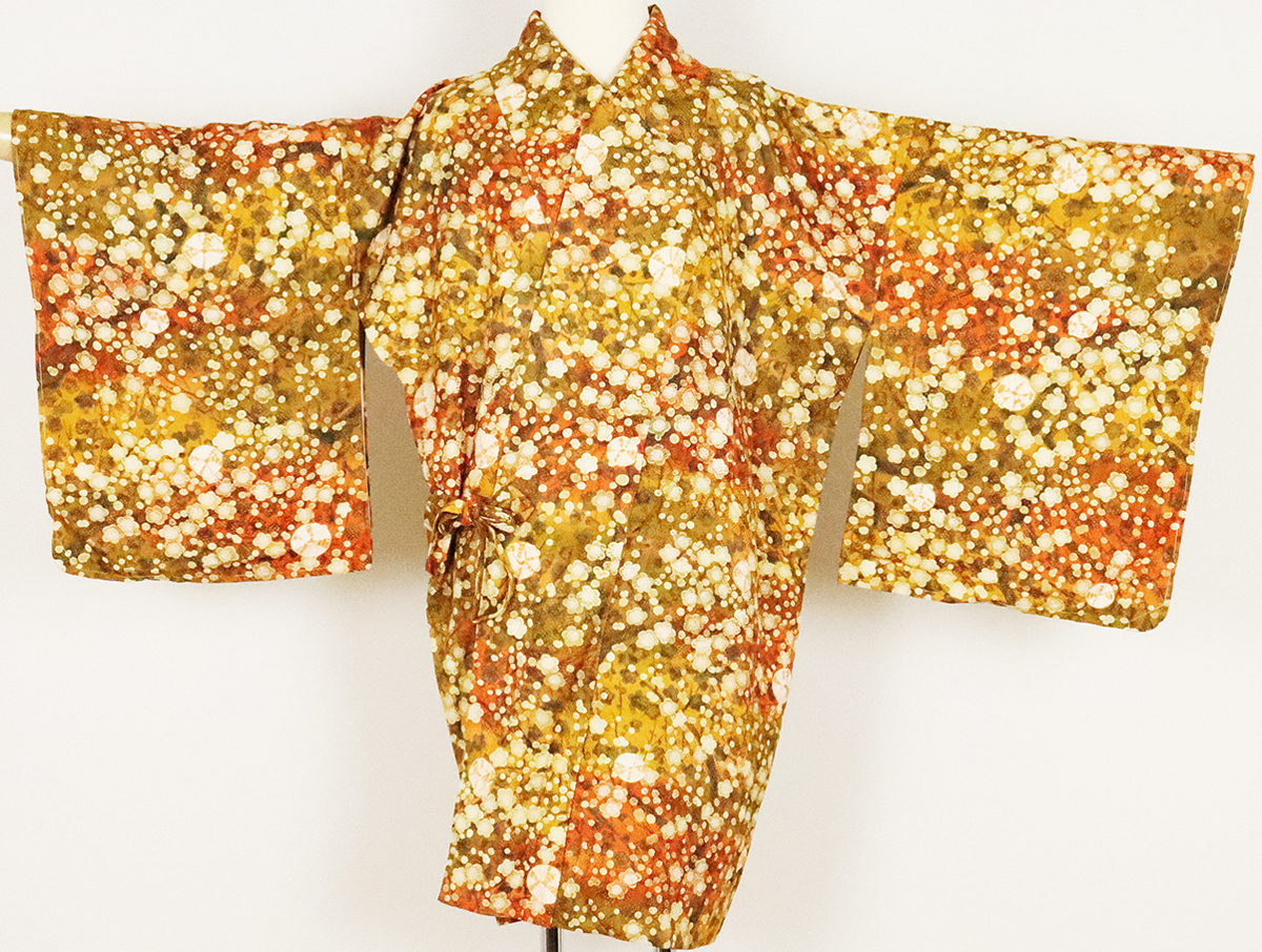 | 和装コート 道中着 橙色・緑ぼかし地絞り花・梅花 未使用品 仕付け付き | |