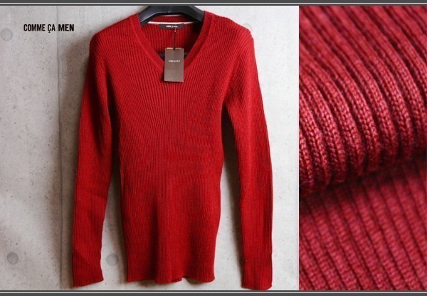 新品 コムサメン Vネック ウール リブ ニット セーター L 深赤/定価1.1万/COMME CA MEN/オールシーズン