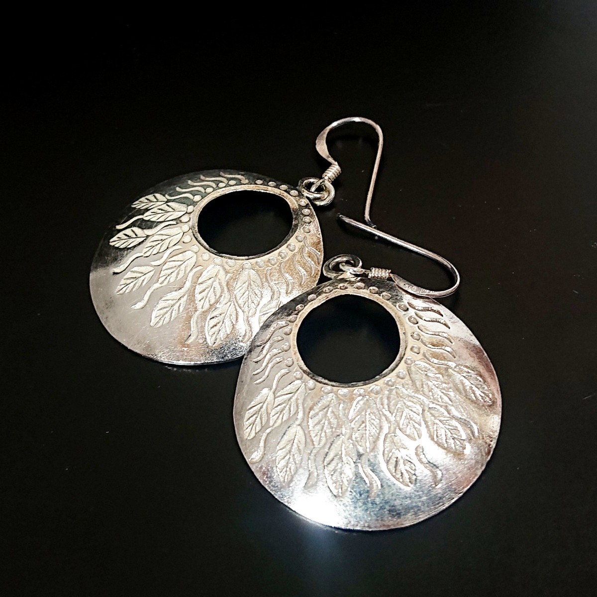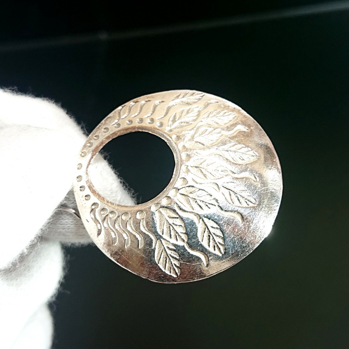 リーフ(葉)のタガネを打ち込んだハンドメイドによる作品で丸いプレートをお皿のように湾曲させたデザインです☆