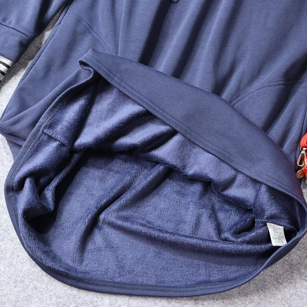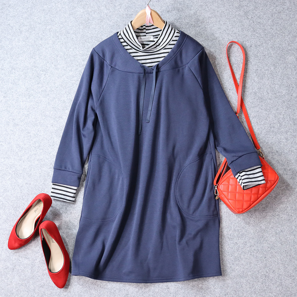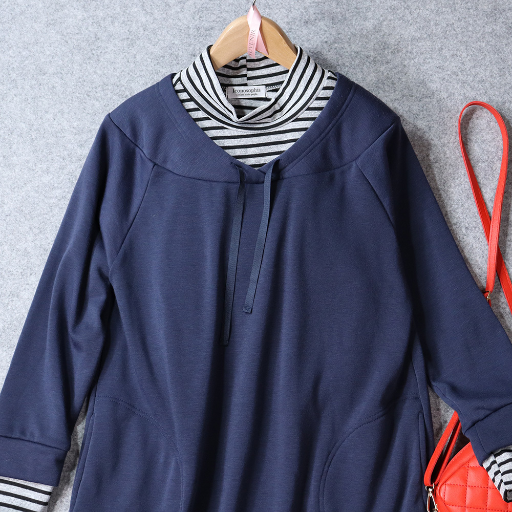 イコノソフィア Iconosophia 暖かくおしゃれな 裏起毛 ストライプインナー レイヤード風 ミディ ワンピース 長袖 ネイビー ミディ丈 M~L | |||