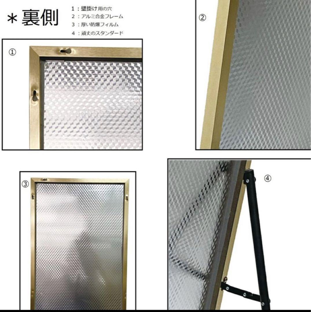 ■商品に不具合があった場合はご対応させて頂きますので、ご安心してお買い求めください。 ■取扱商品は海外製造品の為に、多少のキズや汚れなどがある場合がございます。ご了承下さいませ。 1:全身鏡のサイズ 幅40cm 高さ 150cm 重量 6.5kgくらい ■姿見 鏡正面から見るとフレームが気にならない薄いのデザインHDガラス使用しているので、 映り込んだ物体の色・実現をそのまま鮮明に再現するミラーです。 ■表面ノンフレームミラー、複数台並べてご使用、ダンスルーム、 ヨガ教室、和室、洋室、寝室、店舗を問わずに使えるおしゃれな全身ミラーです。 ■壁掛け、スタンドの2WAYスタイルとなっており、 使わないときには折り畳むことができます。 本体重さ約7kgなので女性一人でもお部屋からお部屋への移動がラクラクと持ち運ぶことができます。 ■壁掛け式 壁に掛けてスペースを節約、安全、永久的、地震の際にも倒壊の心配がありません。 ■スタンド式 賃貸住宅が壁に穴を開けたくない人は立てて使えます,また飛散防止加工がされており破損時にも安心です