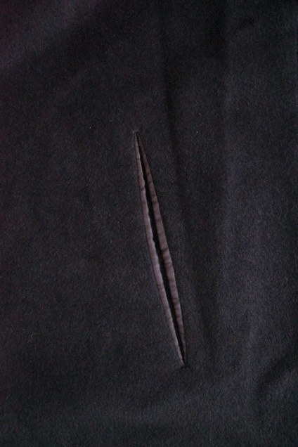 ポケット取り出し口周りにサテン生地の縁取りあり