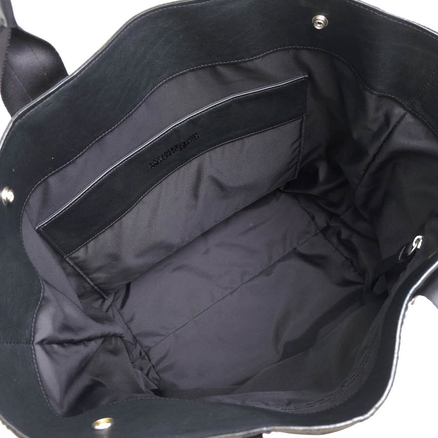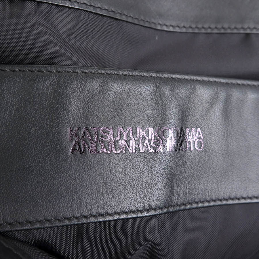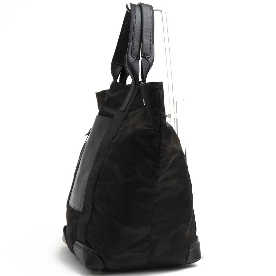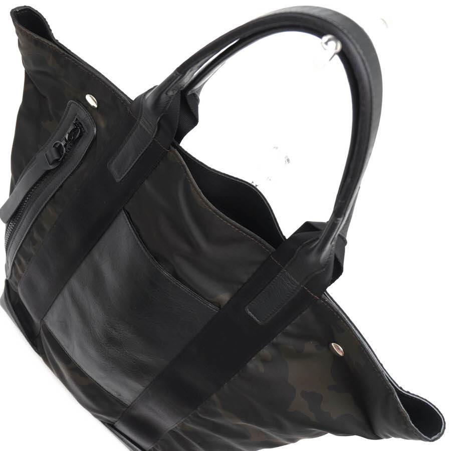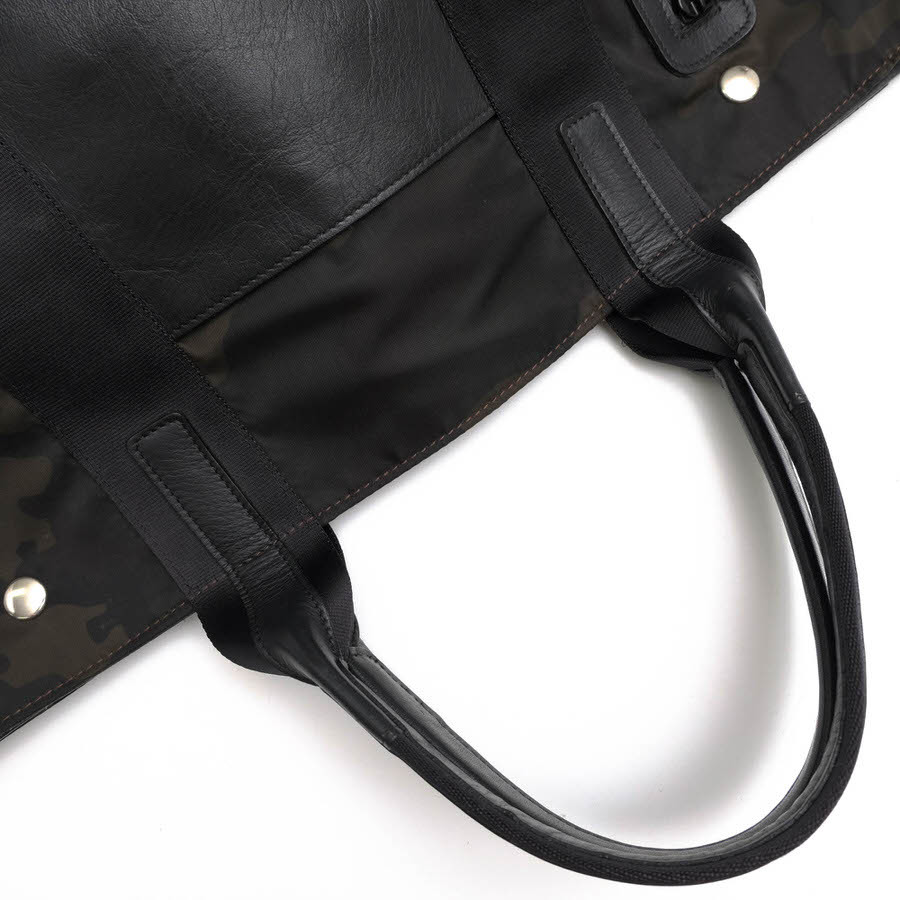 junhashimotoが別注したKATSUYUKIKODAMAの限定版トートバッグ、ABSTRACTION TOTE-L。落ち着いたマットブラックのレザーとjunhashimotoの特徴的なカモフラナイロンが魅力のナイロン素材と、ハンドルと底部のレザー使いが上品さを引き立てます。美しいシルエットを維持するように作られています。フロントポケットはriri社のファスナー付きで、内部にはスマートフォンやカードケースなどが収納可能な2つのポケットを完備。 |